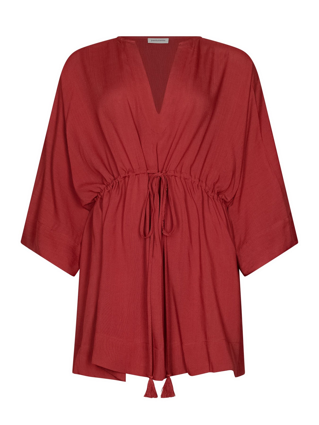 De cover-up is uitgevoerd in een warme roodtint en heeft een elegante, losvallende pasvorm die comfortabel om het lichaam valt. Het model is voorzien van een vrouwelijke V-hals en driekwart mouwen, wat zorgt voor een luchtige en zomerse uitstraling. In de taille is het jurkje afgewerkt met een verstelbaar koord met decoratieve uiteinden, waarmee je de pasvorm naar wens kunt aanpassen. Dit cover-up jurkje is ideaal om over je badkleding te dragen tijdens een dag aan het strand, bij het zwembad of op vakantie.