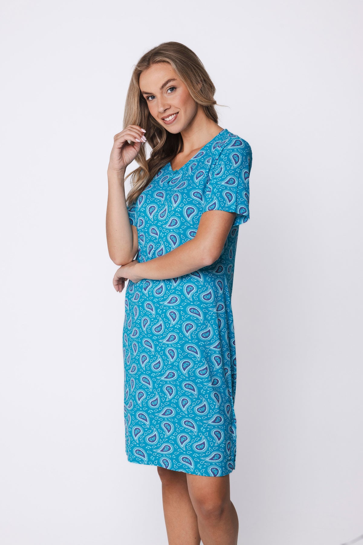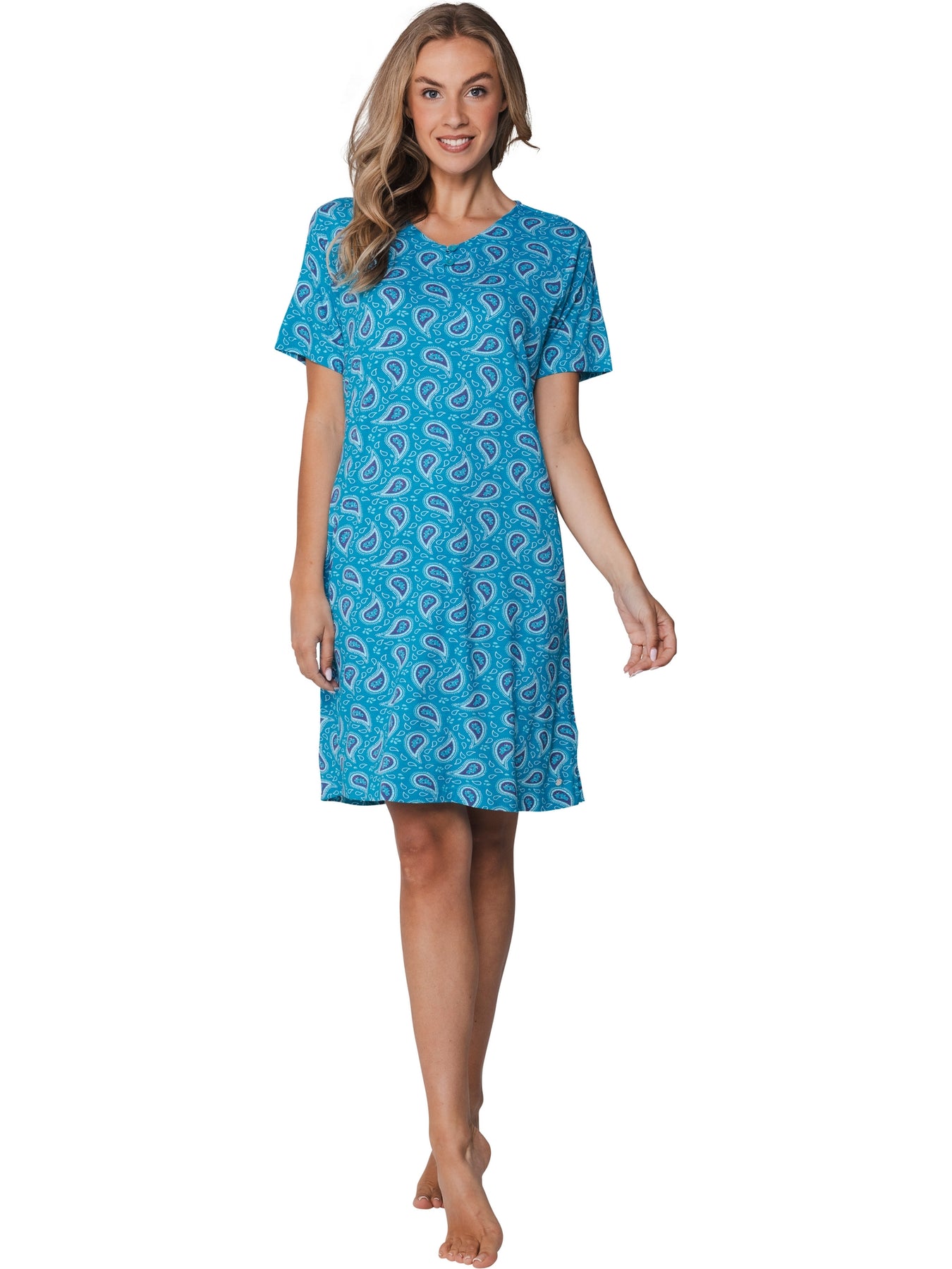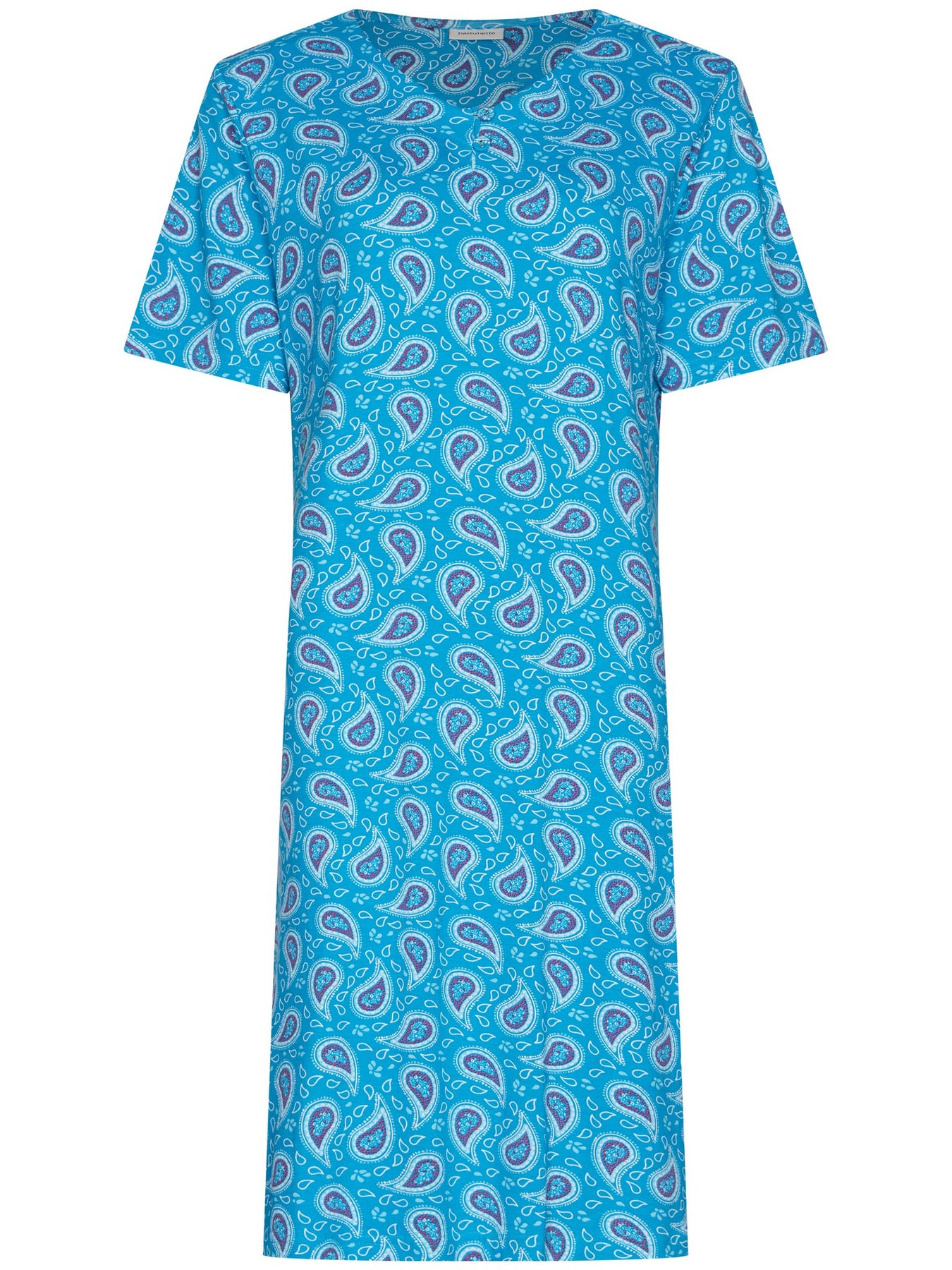Het nachthemd is uitgevoerd in een turquoise kleur en heeft een speels fantasie dessin met paisley-achtige vormen, wat zorgt voor een frisse en zomerse uitstraling.