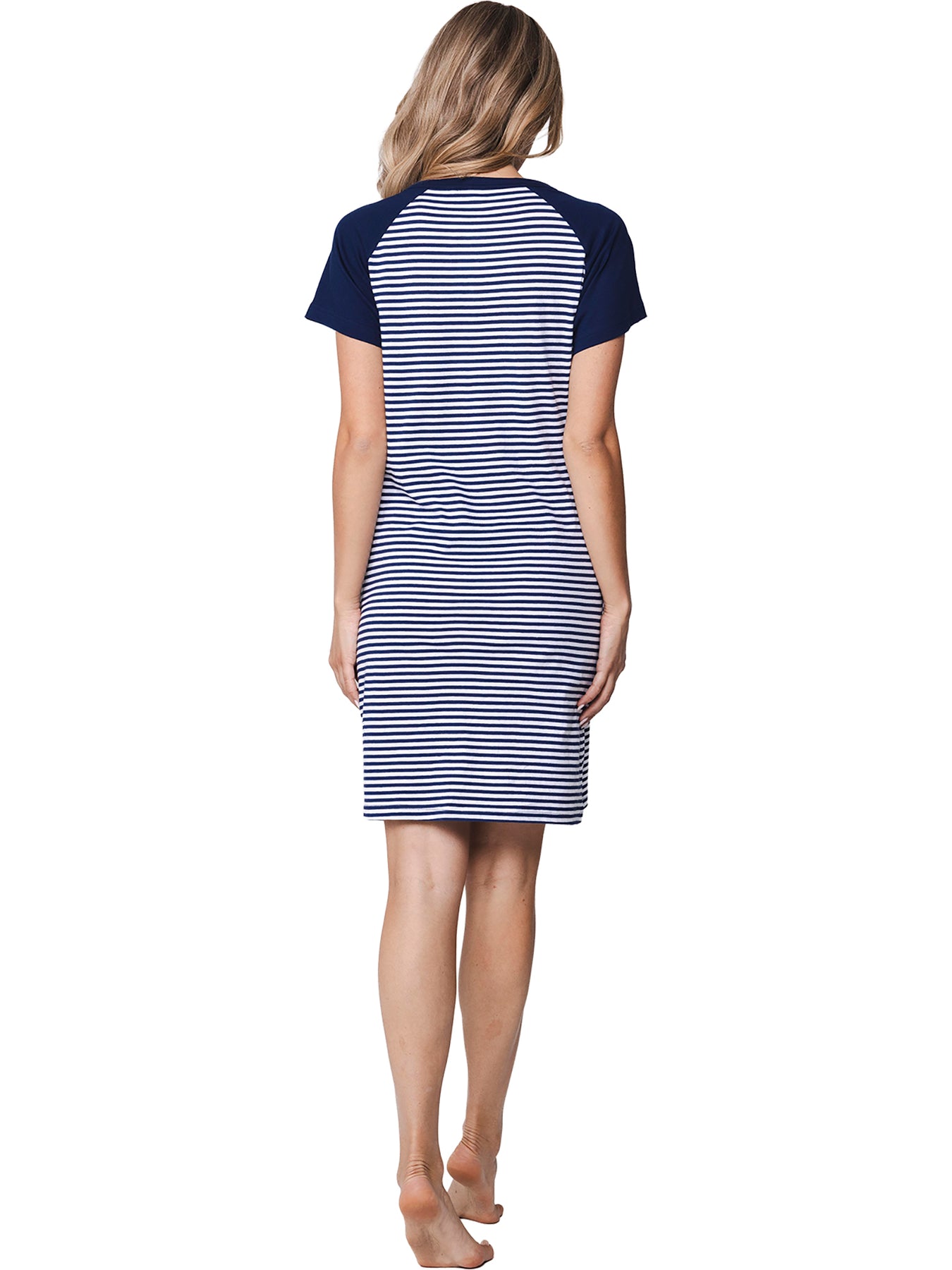 Het nachthemd is uitgevoerd in een donkerblauwe en wit tijdloos streepdessin. Het model heeft korte mouwen in een uni donkerblauwe kleur en is voorzien van een ronde hals met een subtiele V-opening en knoopsluiting, wat zorgt voor een klassieke en comfortabele uitstraling.