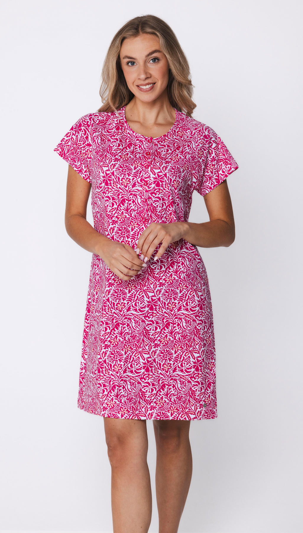 Het nachthemd is wit van kleur en heeft een speels fantasie dessin in donkerroze. Het nachthemd heeft korte mouwen en een ronde hals met knoopsluiting, wat zorgt voor extra gemak en een vrouwelijke uitstraling.