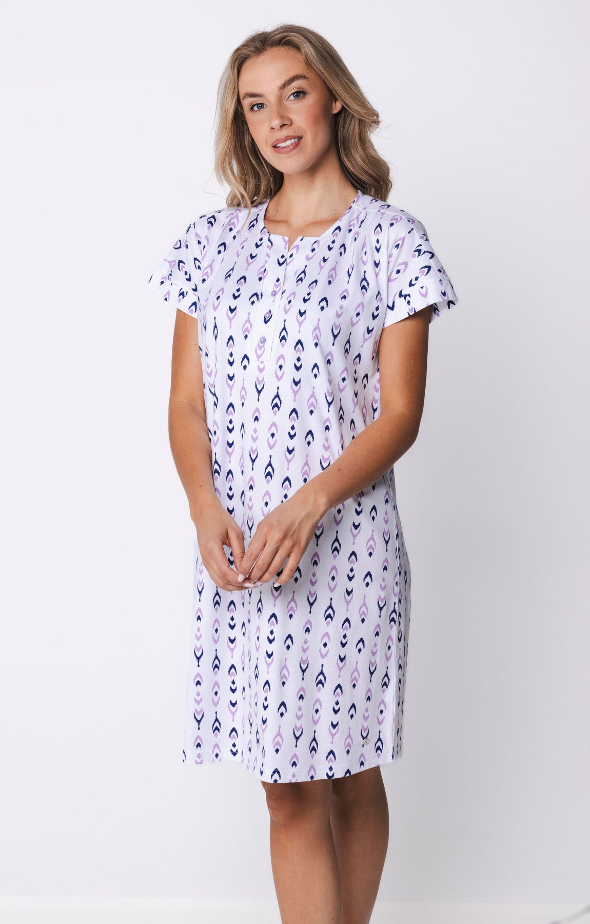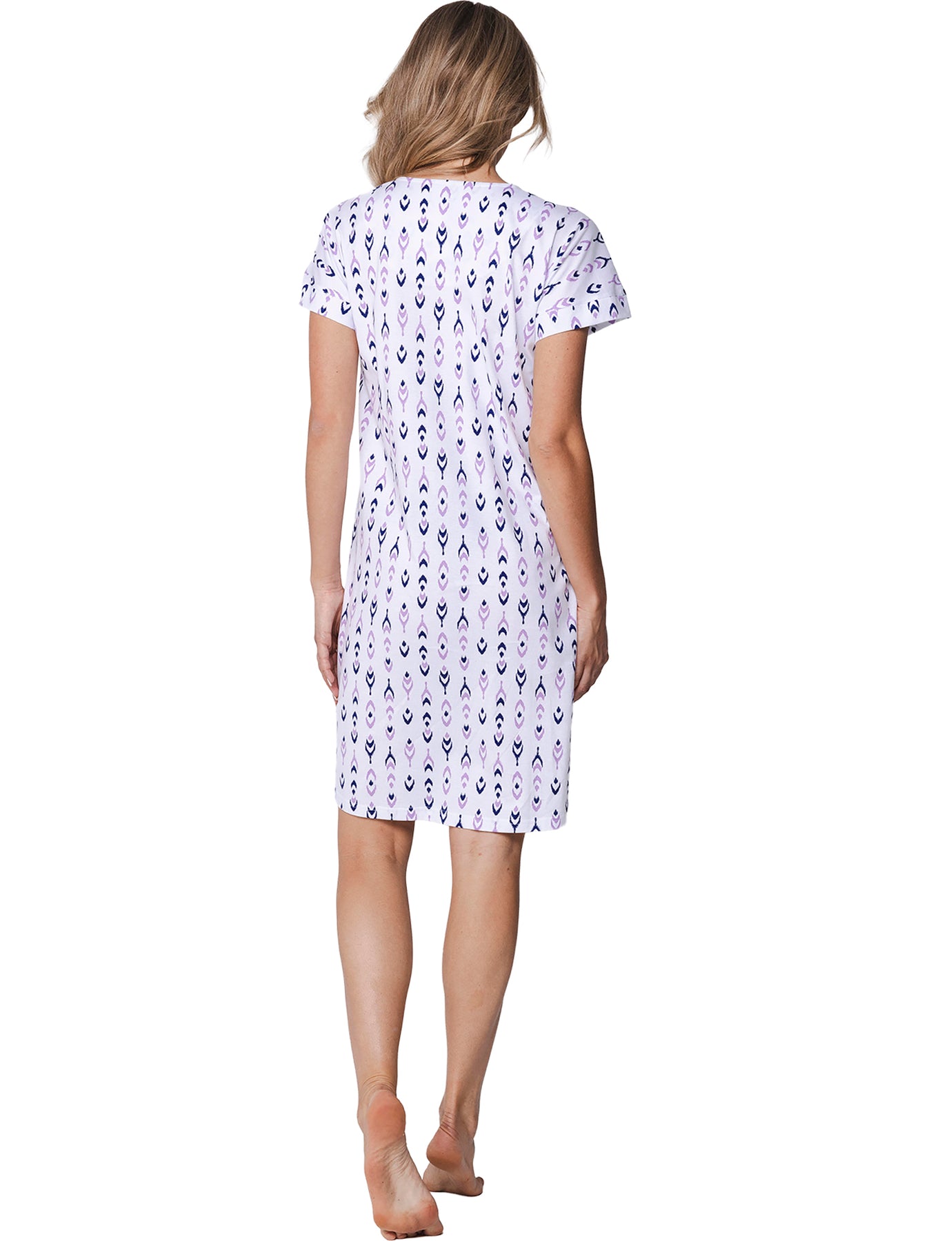 Het nachthemd is wit van kleur met een speels fantasie dessin in paarse tinten. Het model heeft korte mouwen en een ronde halslijn met knoopsluiting voor extra draaggemak.