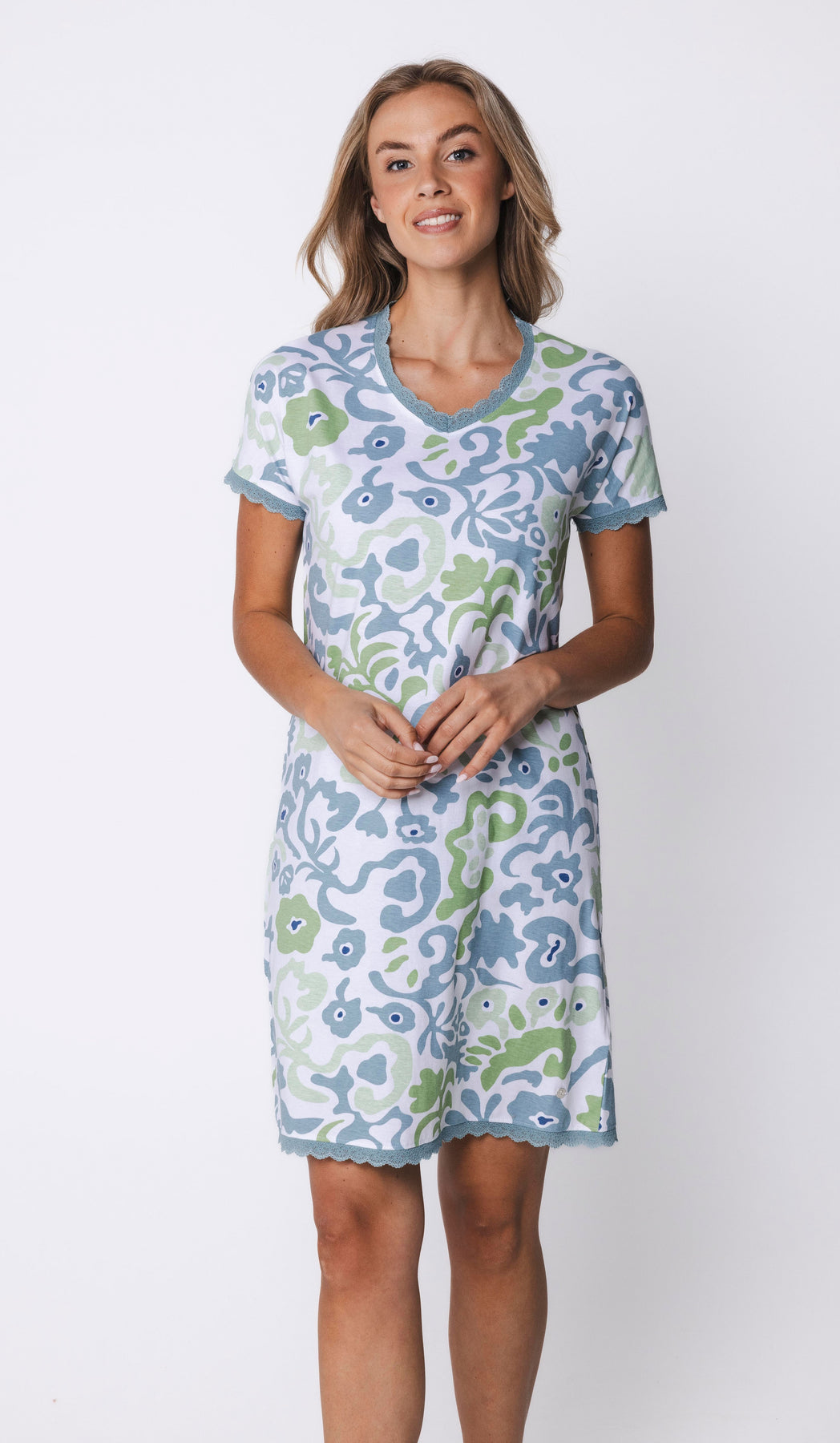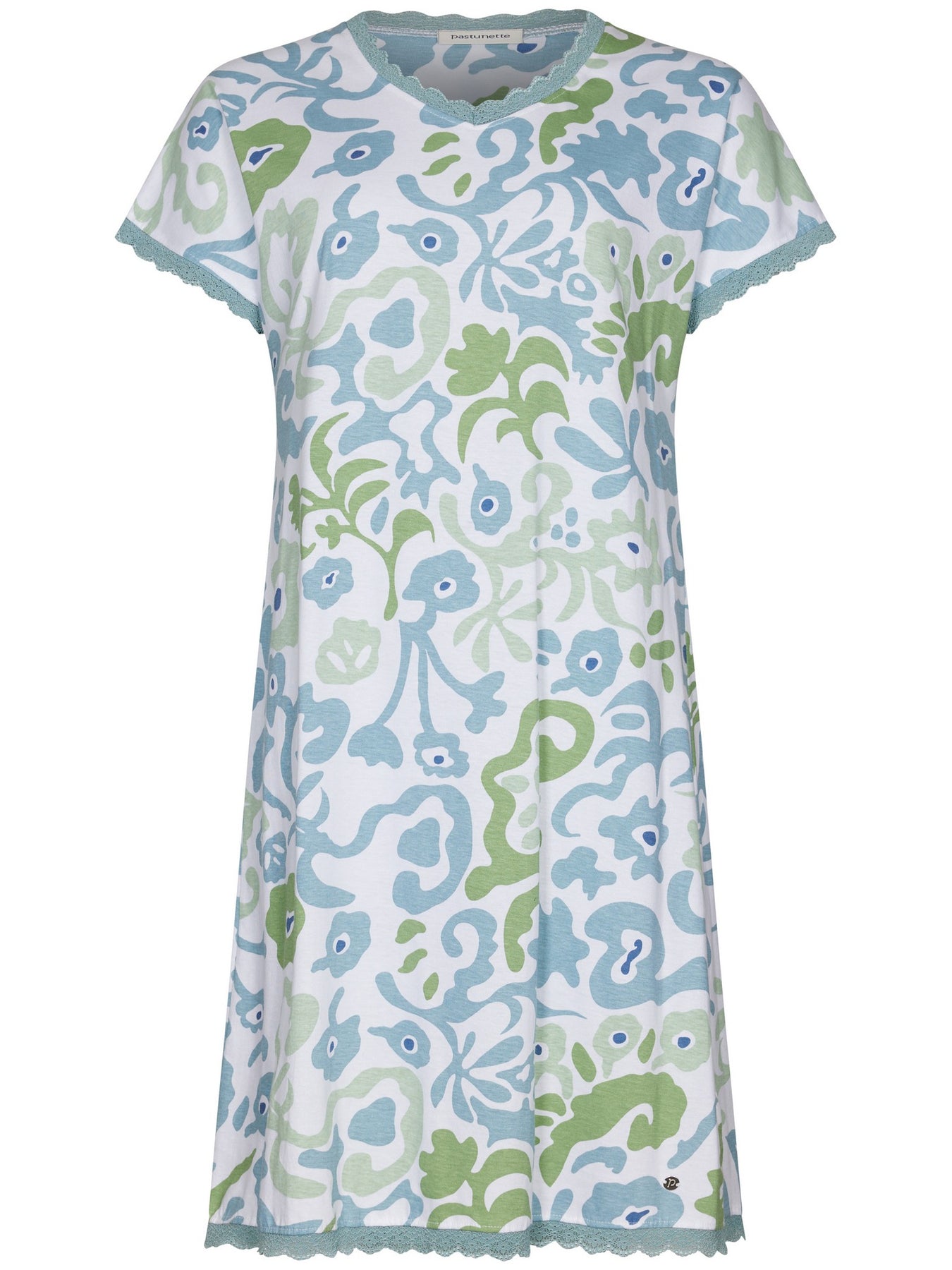 Het nachthemd is uitgevoerd in een witte kleur en heeft een speels fantasie dessin in blauw en groen, wat zorgt voor een frisse en zomerse uitstraling. Het model heeft korte mouwen en een elegante V-hals. Een verfijnd detail is het kant langs de mouwen, de hals en aan de onderzijde van het nachthemd.