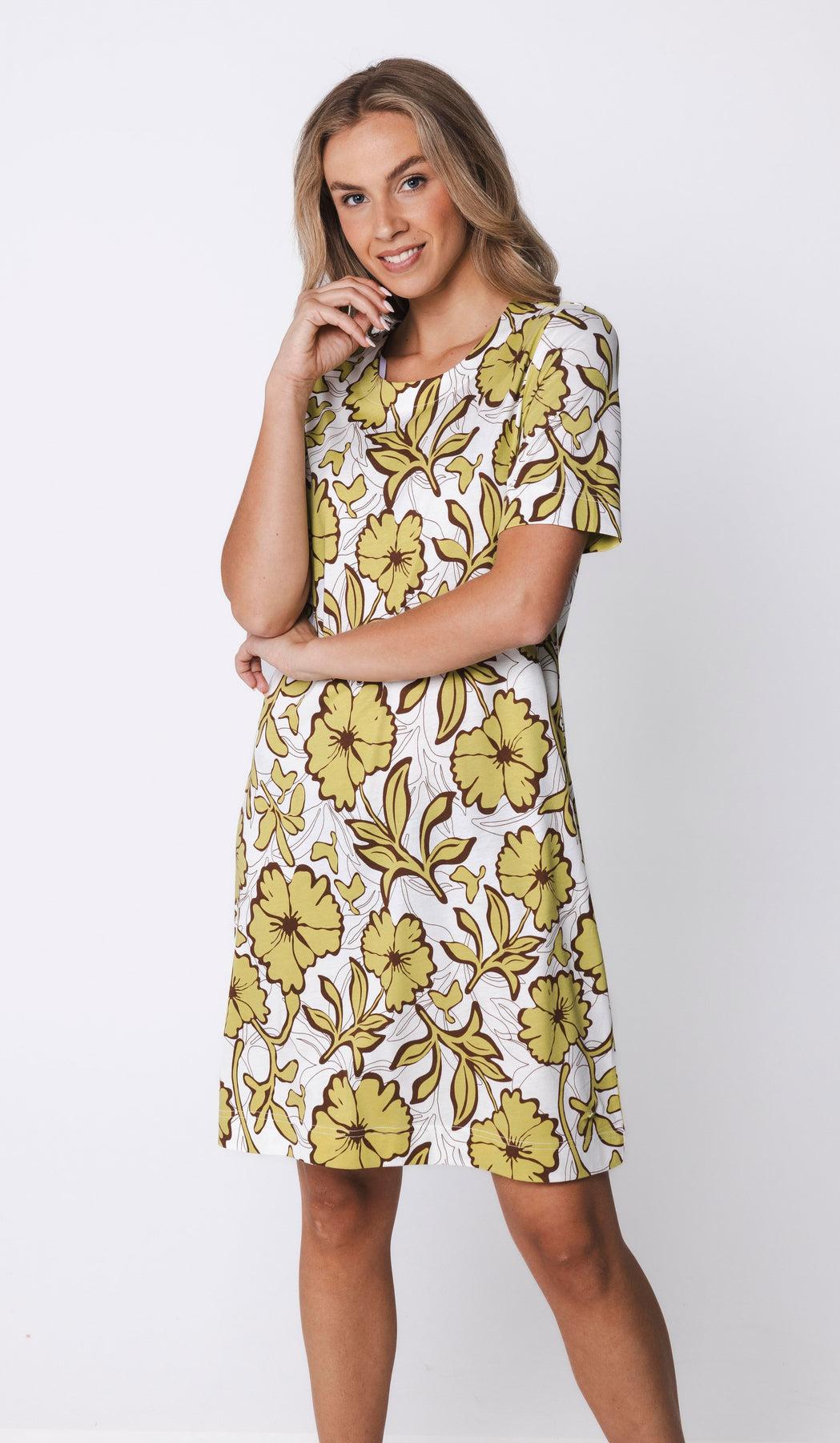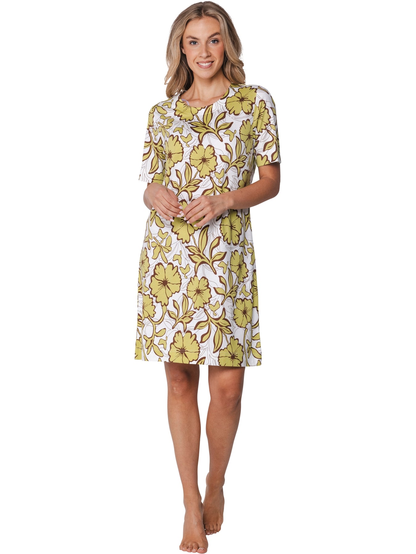 Het nachthemd is uitgevoerd in een witte kleur en heeft een opvallend bloemen dessin in het groen en bruin, wat zorgt voor een zomerse uitstraling. Het model heeft korte mouwen en een ronde halslijn.