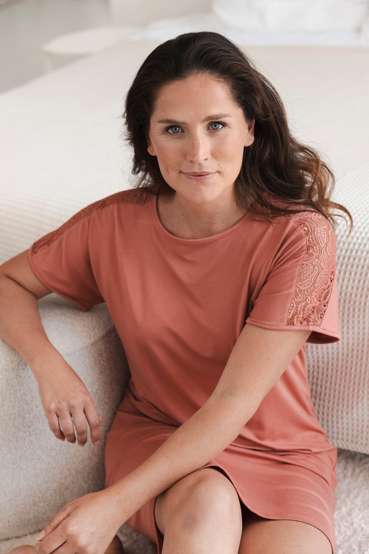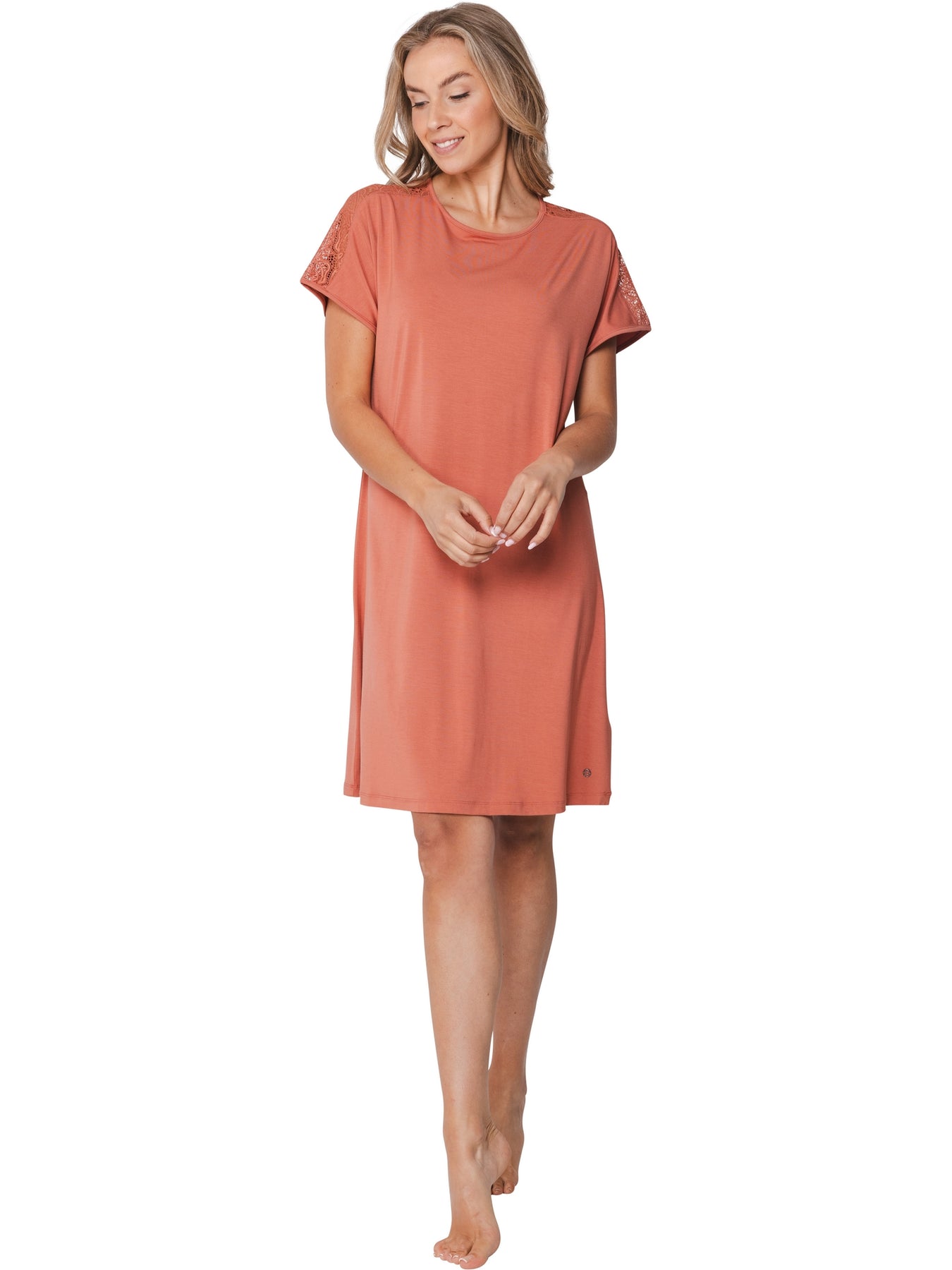 Het nachthemd is uitgevoerd in een uni terra kleur en heeft korte mouwen met een ronde hals. Een verfijnd detail is het kant op de schouders en de rug, wat het nachthemd een vrouwelijke en luxe uitstraling geeft.