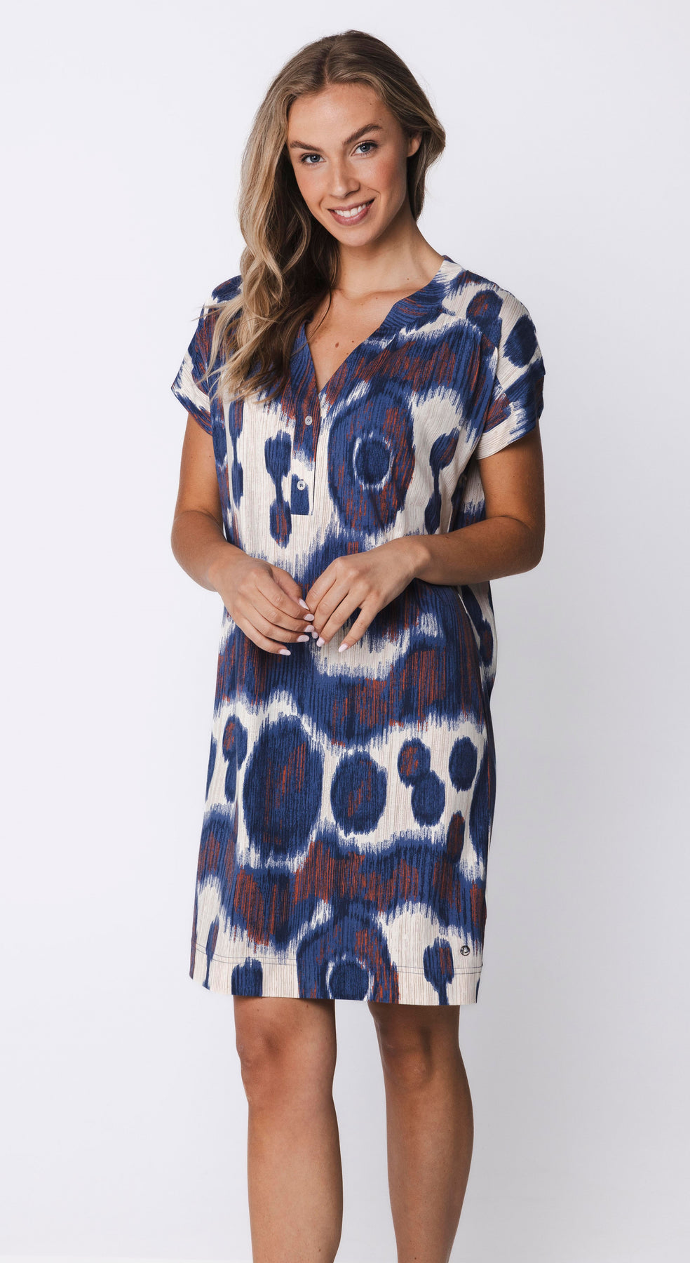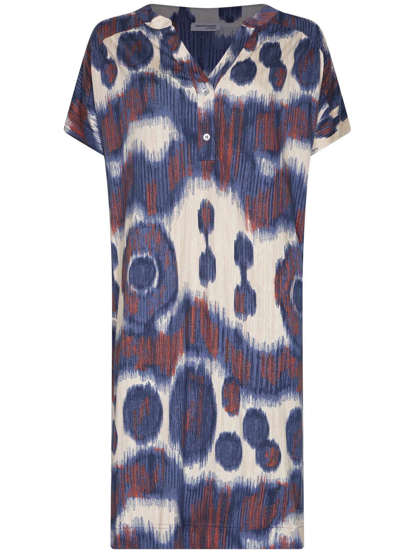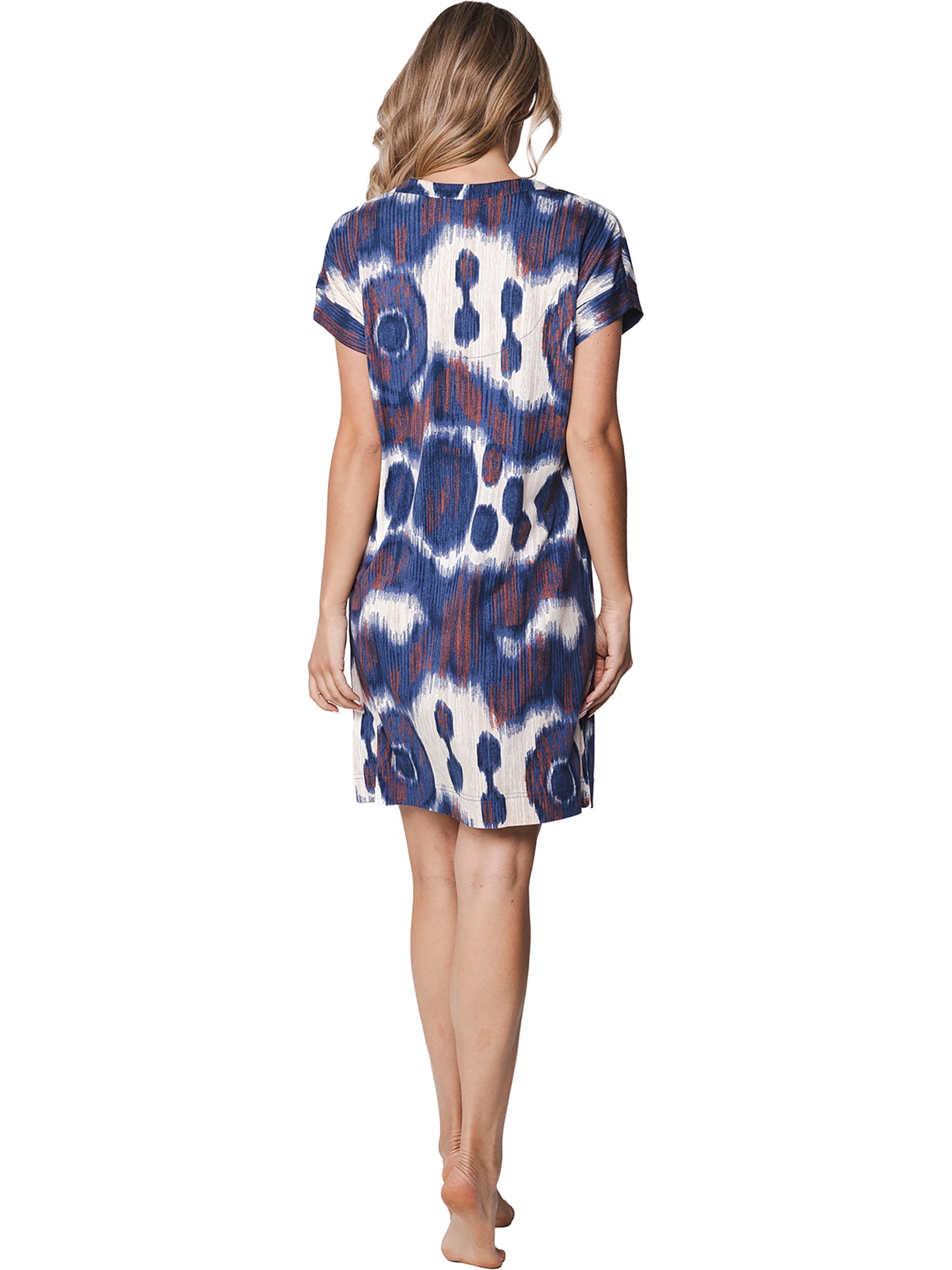 Het nachthemd is uitgevoerd in een crème/beige kleur en heeft een fantasie dessin in blauwe tinten met een donkerrood accent. Het model heeft korte mouwen en is voorzien van een v-hals met knoopsluiting.