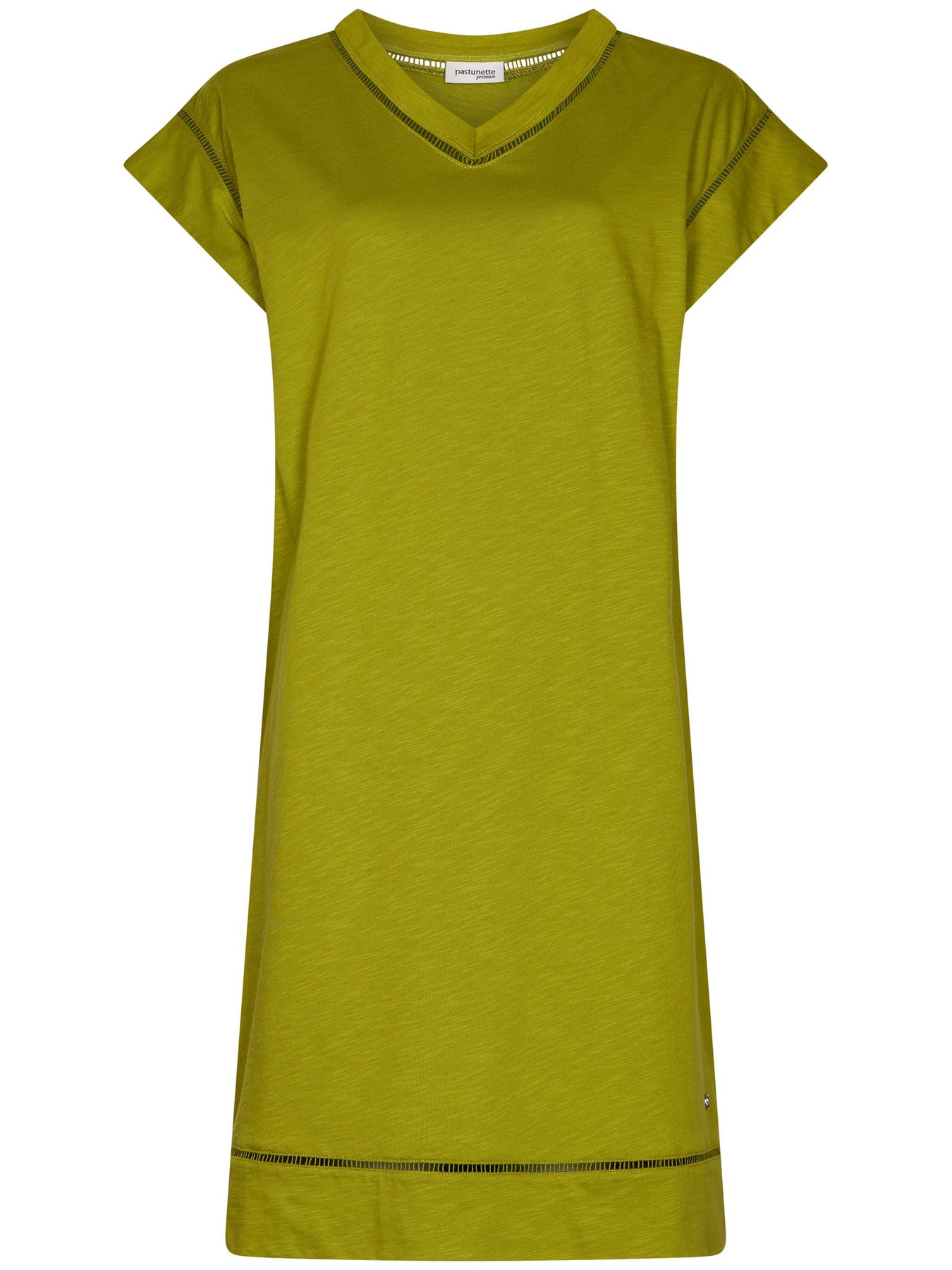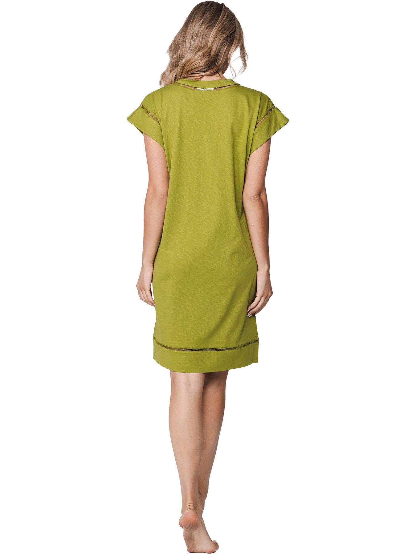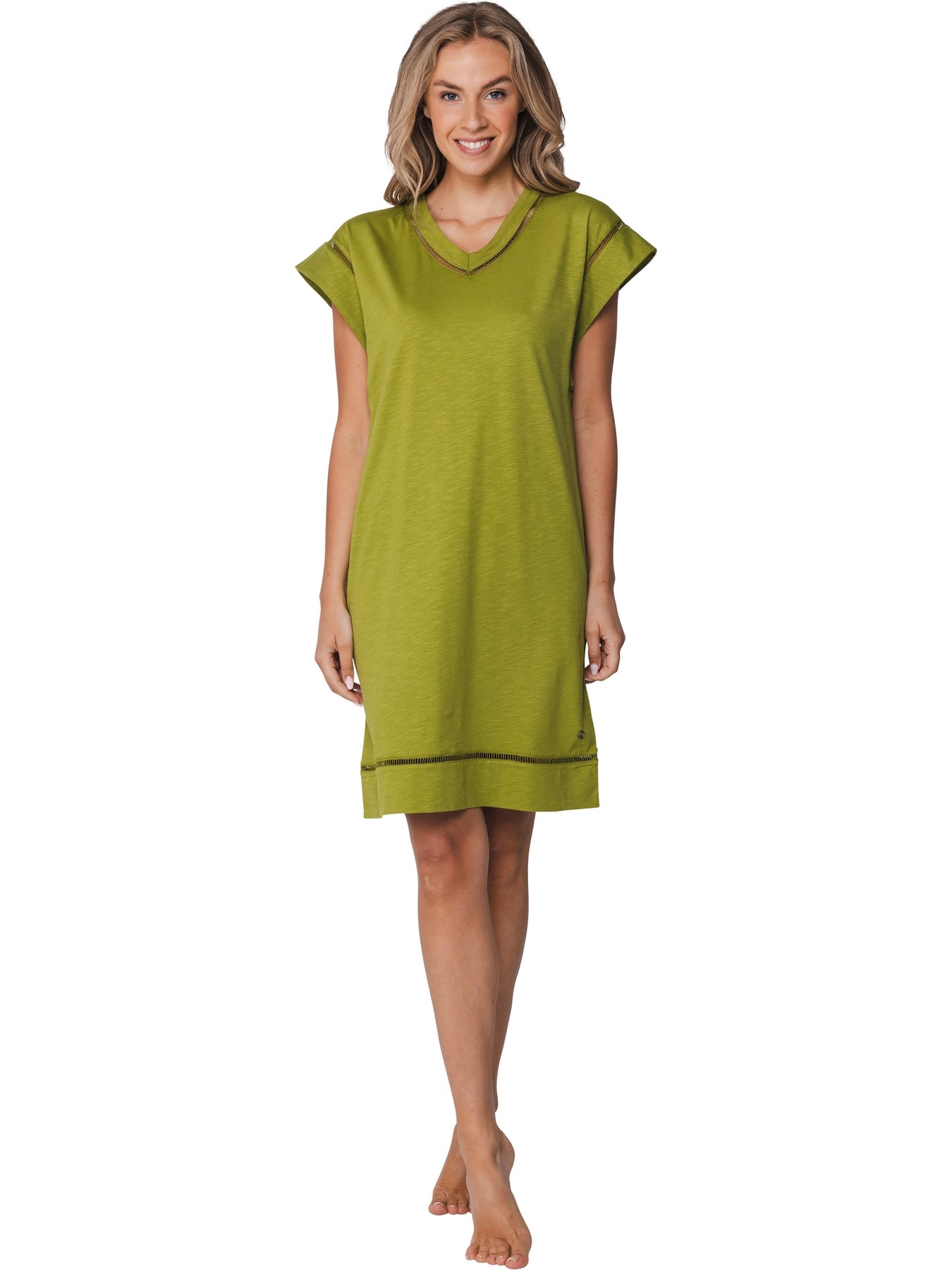 Het nachthemd is uitgevoerd in een uni groene kleur en heeft korte kapmouwtjes met een vrouwelijke V-hals. Een mooi detail is de verfijnde afwerking bij de mouwen, hals en onderkant van het nachthemd, wat zorgt voor een elegante uitstraling.