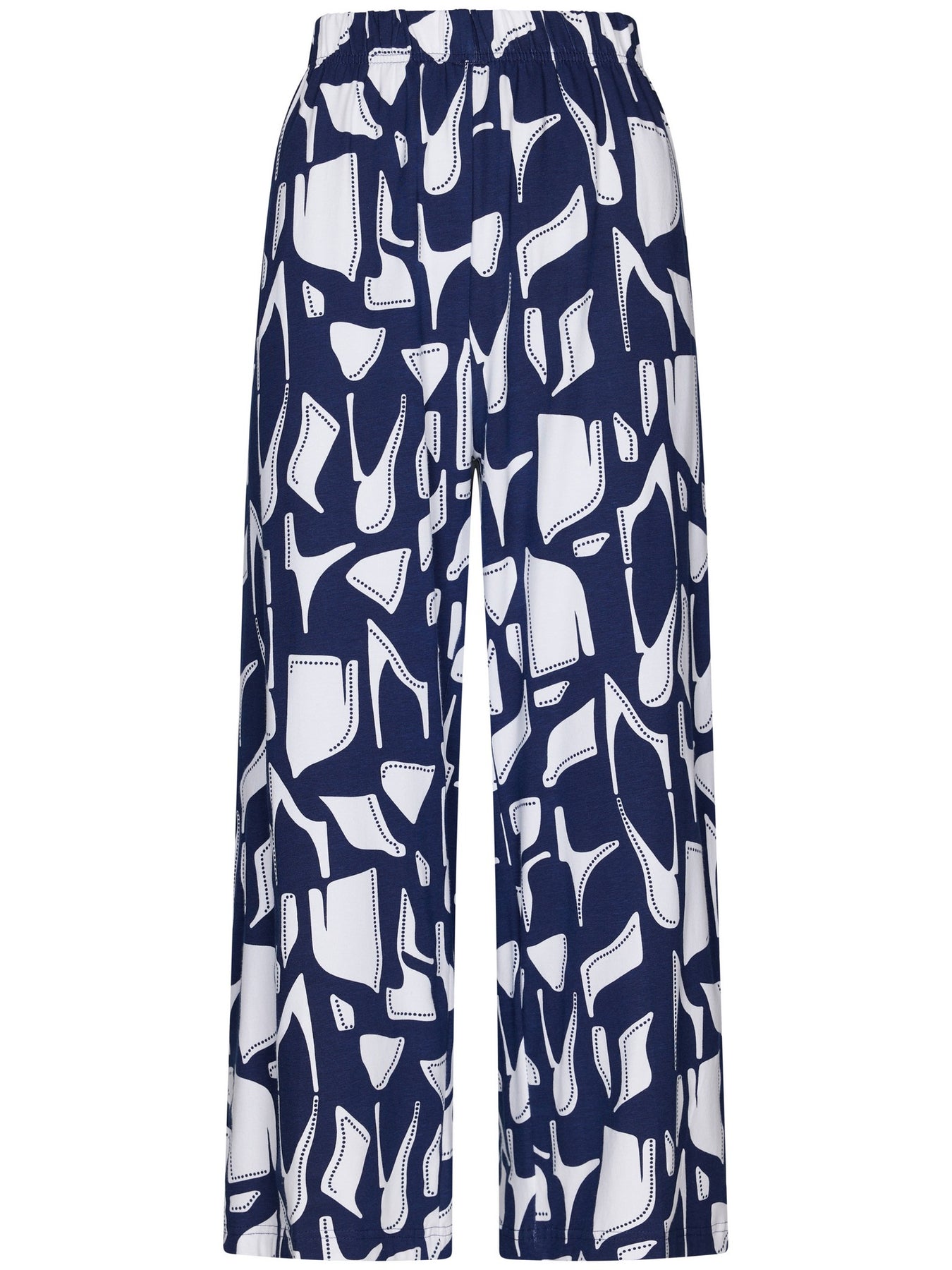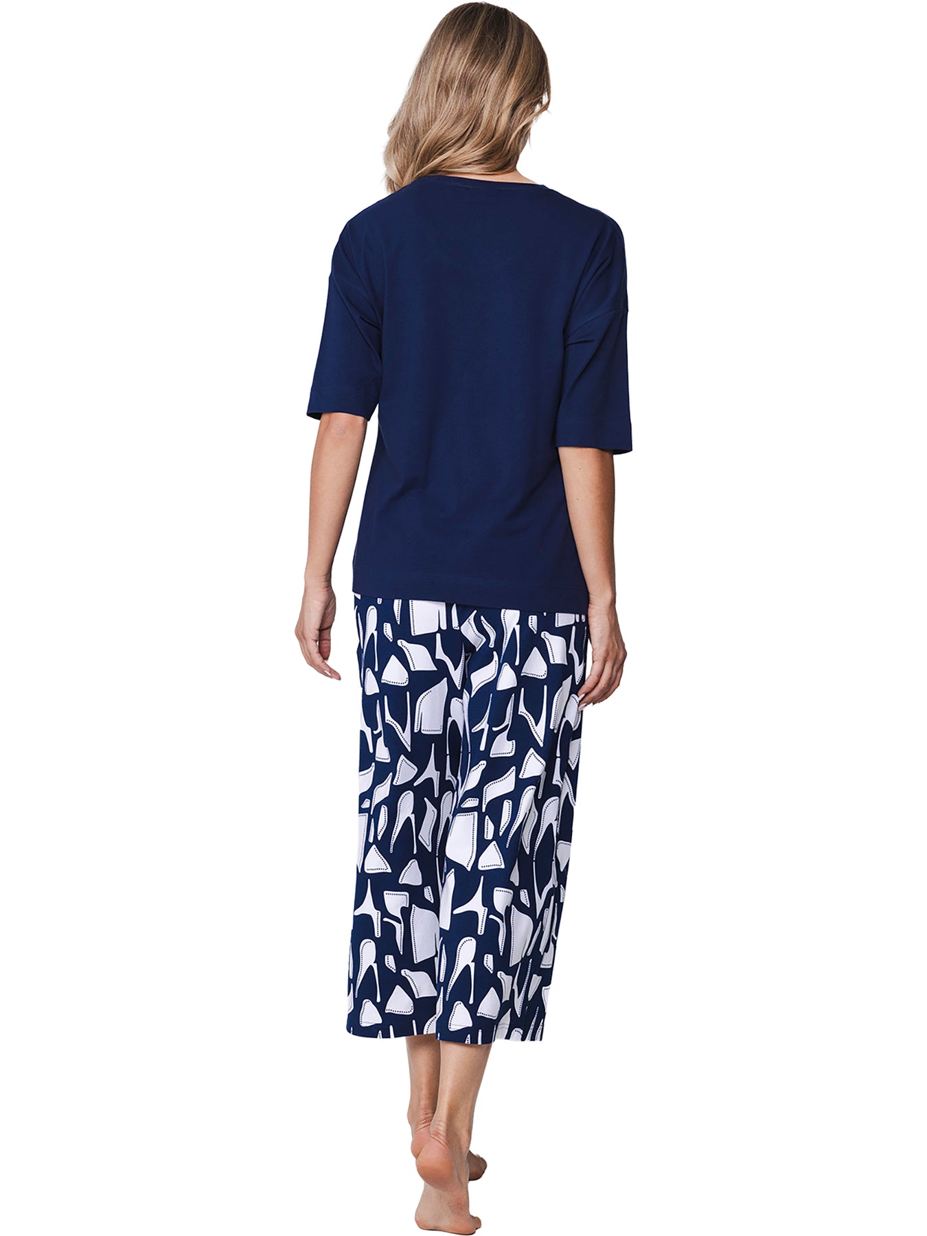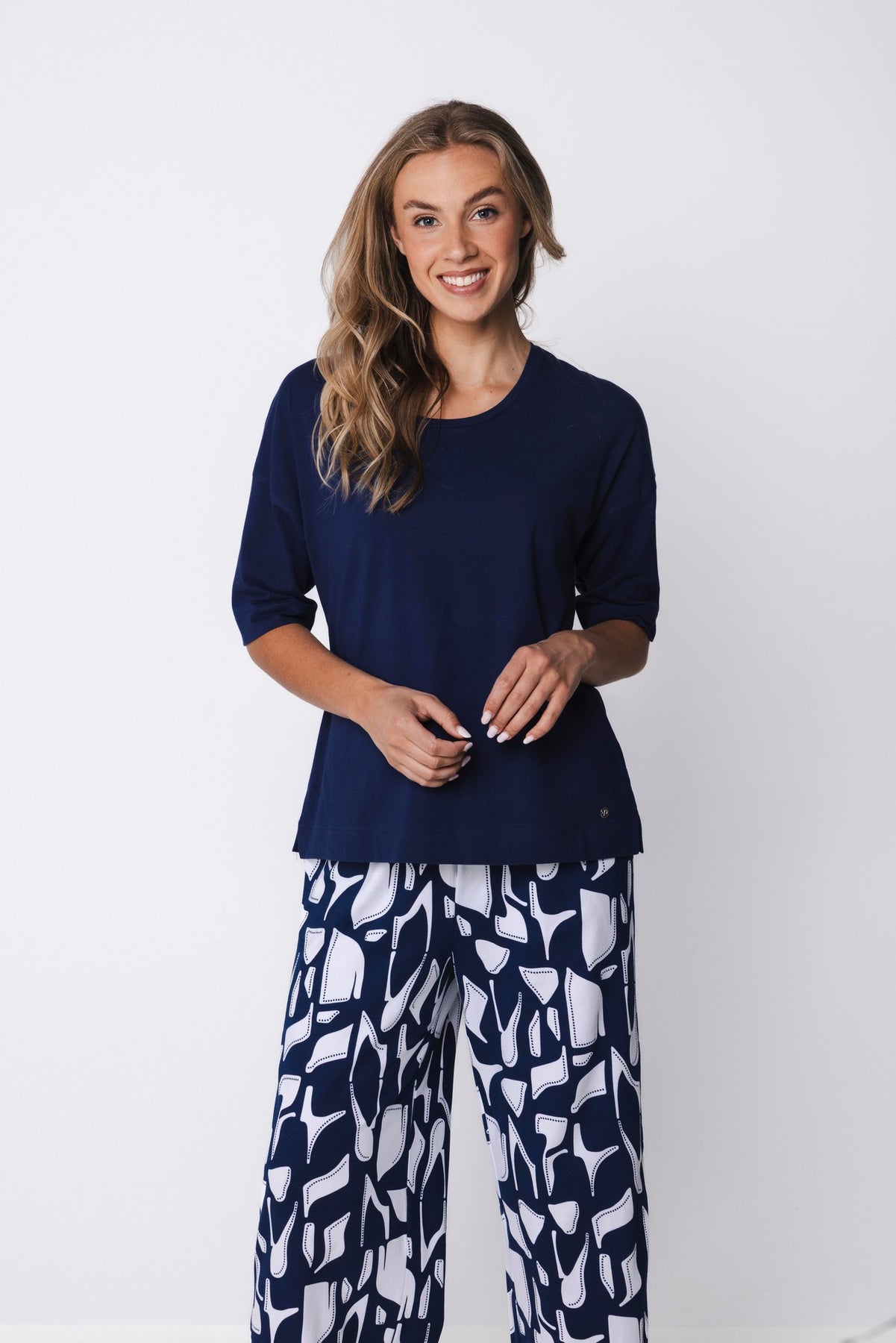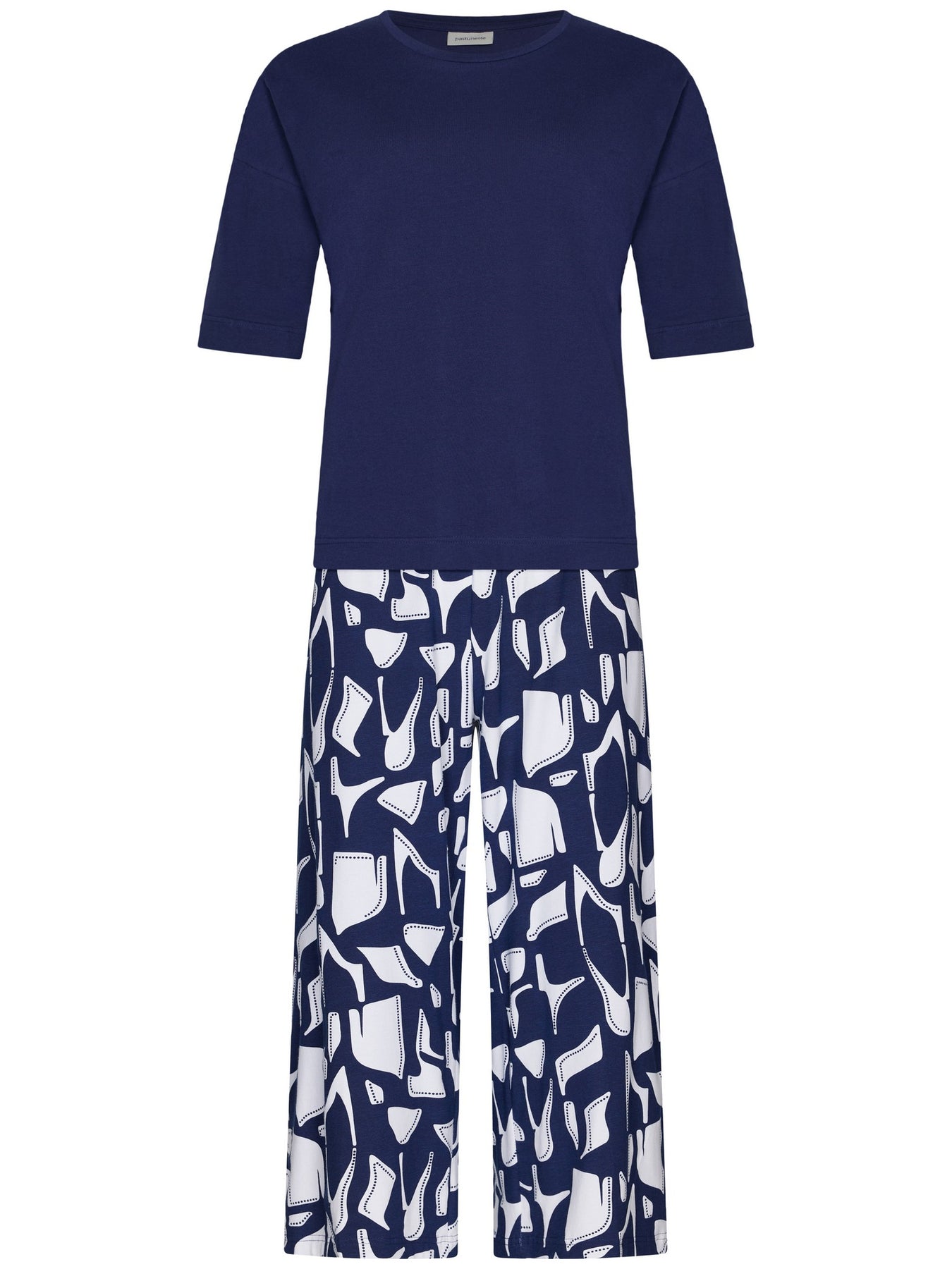 De top is uitgevoerd in een donkerblauwe kleur en heeft halve mouwen en een ronde hals. Dankzij het minimalistische ontwerp vormt de top een rustige basis binnen de set. De driekwart broek is uitgevoerd in donkerblauw met een opvallend grafisch dessin in wit, wat zorgt voor een speels en eigentijds contrast. De broek heeft een elastische tailleband voor een comfortabele en optimale pasvorm.