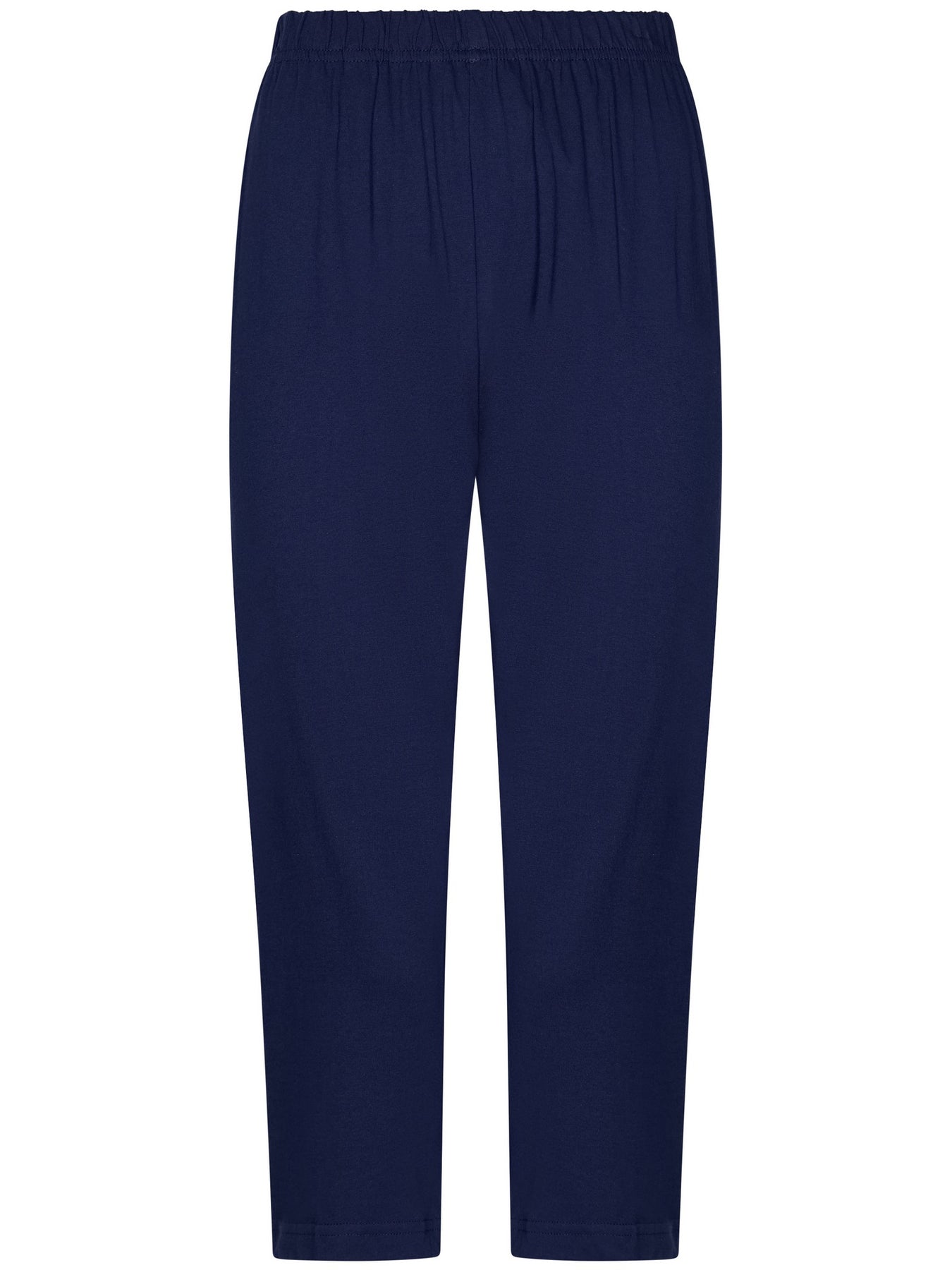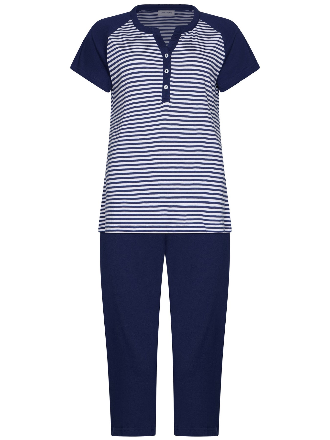 De top is uitgevoerd in een donkerblauwe kleur met een fijn streepdessin in wit. De ronde hals loopt over in een subtiele V-hals met knoopsluiting, wat zorgt voor een sportieve en vrouwelijke uitstraling. De mouwen zijn uni donkerblauw en vormen een mooi contrast met het gestreepte voor- en achterpand. De driekwart broek is eveneens uni donkerblauw en sluit hier perfect op aan. De broek is voorzien van een elastische tailleband voor een comfortabele en optimale pasvorm.