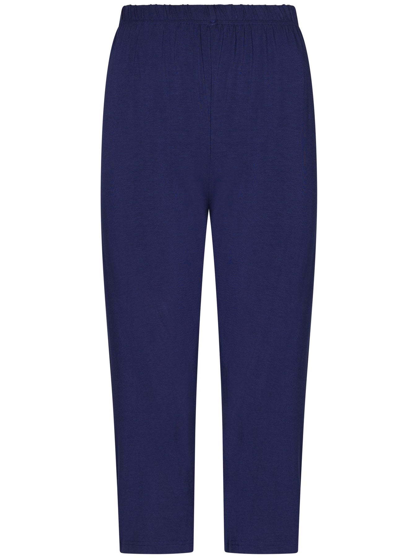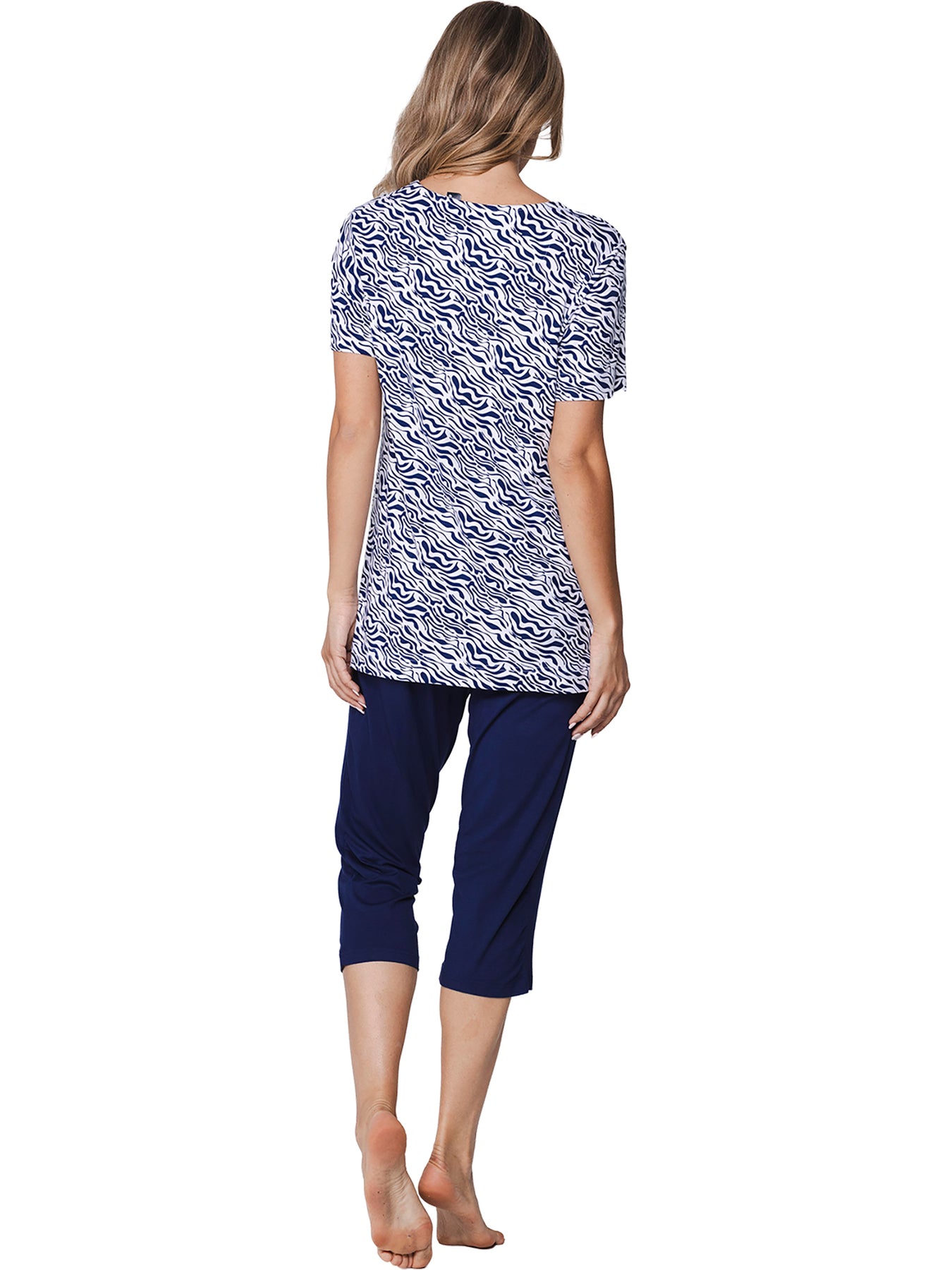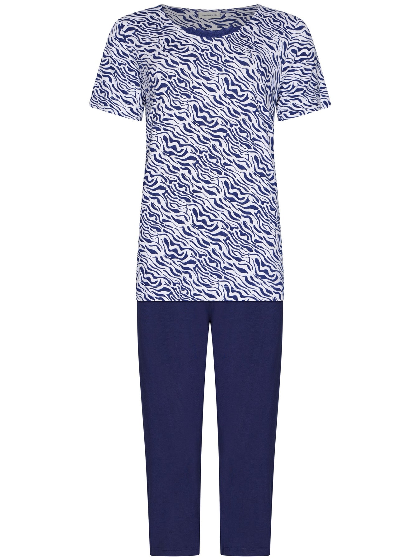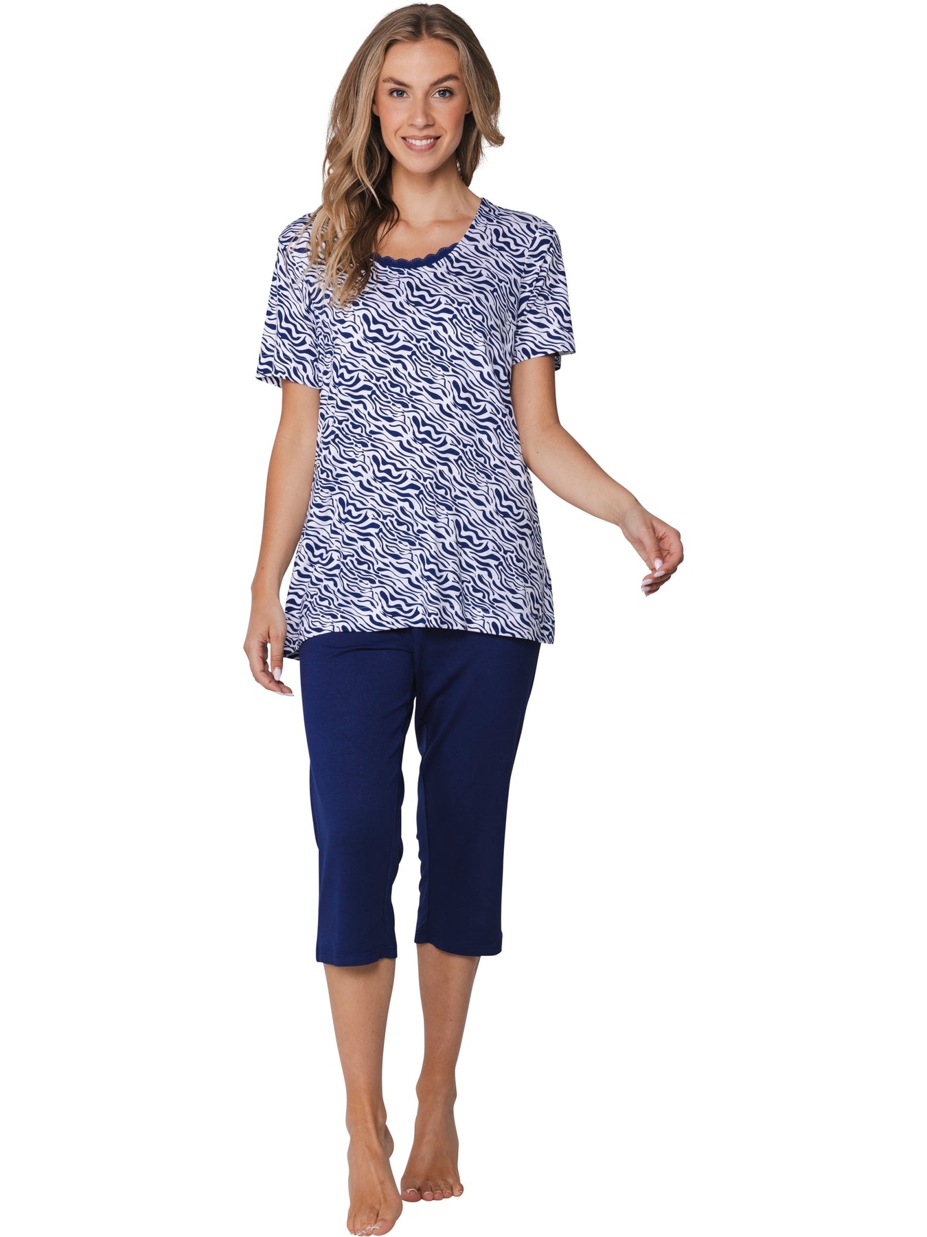 De top heeft een wiite basis met een donkerblauw animal dessin en is voorzien van korte mouwen en een ronde hals. Een verfijnd detail is het subtiele kant langs de halslijn, wat zorgt voor een vrouwelijke touch. De bijpassende broek is uitgevoerd in uni donkerblauw en heeft een comfortabele elastische tailleband voor een perfecte pasvorm.