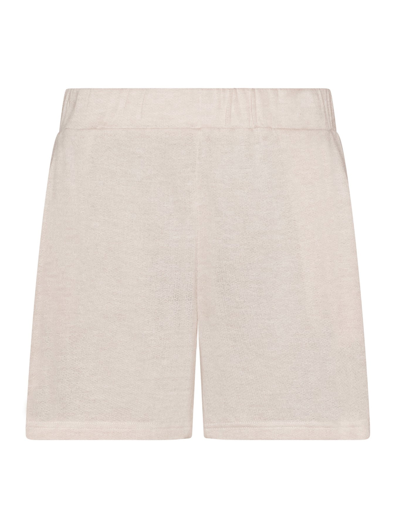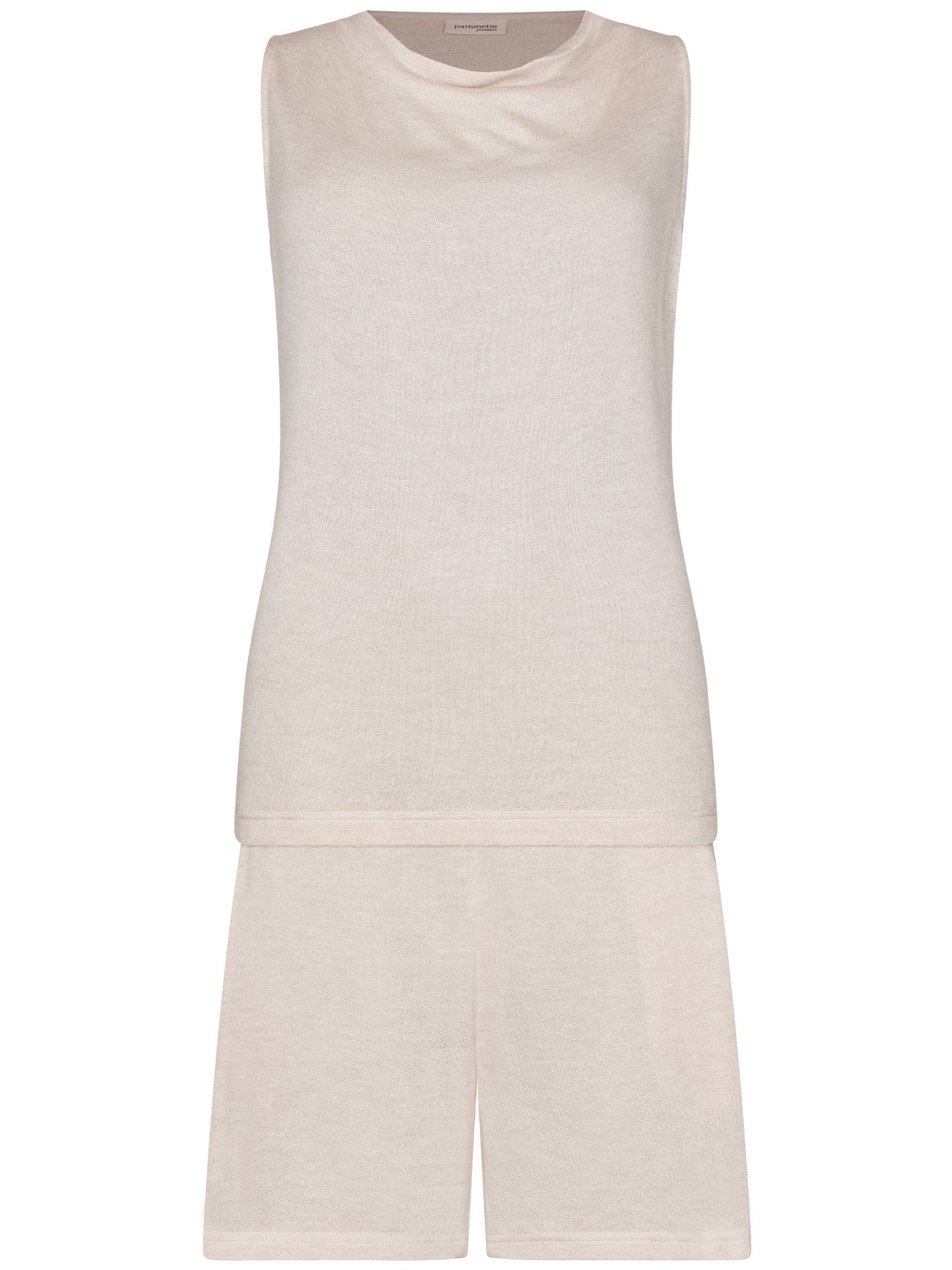 De set is lichtbeige van kleur. De top is mouwloos en uitgevoerd met een ronde hals, wat zorgt voor een luchtige en ontspannen uitstraling. De korte broek heeft een comfortabele elastische tailleband. De afgeronde onderkant van de broekspijpen geeft de set een vrouwelijke en speelse look.