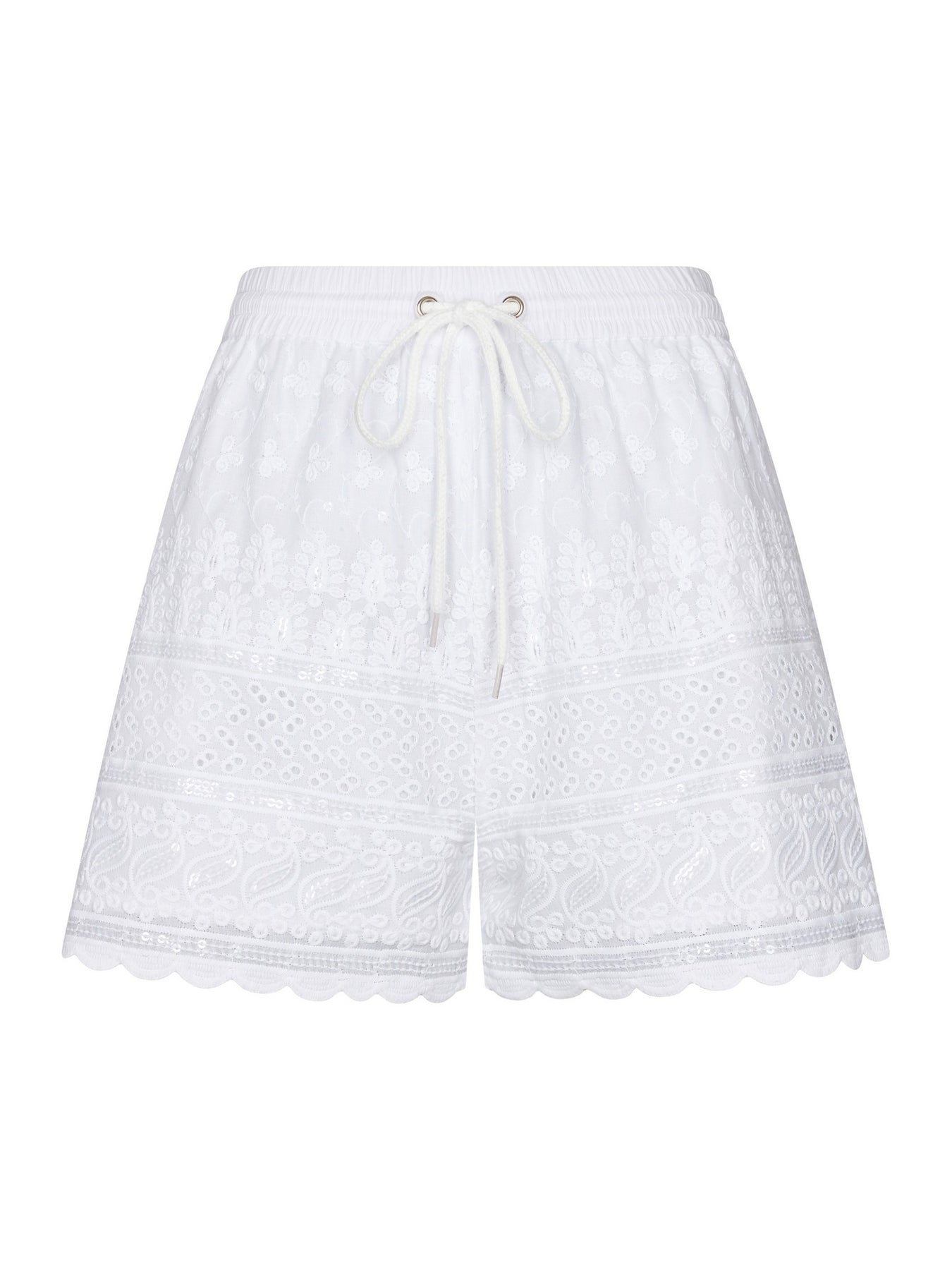 Deze beach short uit de serie Sunveil is jouw go-to voor instant summer vibes. Fris wit, verfijnde broderie en subtiele pailletten die zacht glinsteren in de zon. Precies genoeg shine om op te vallen, zonder over the top te zijn.