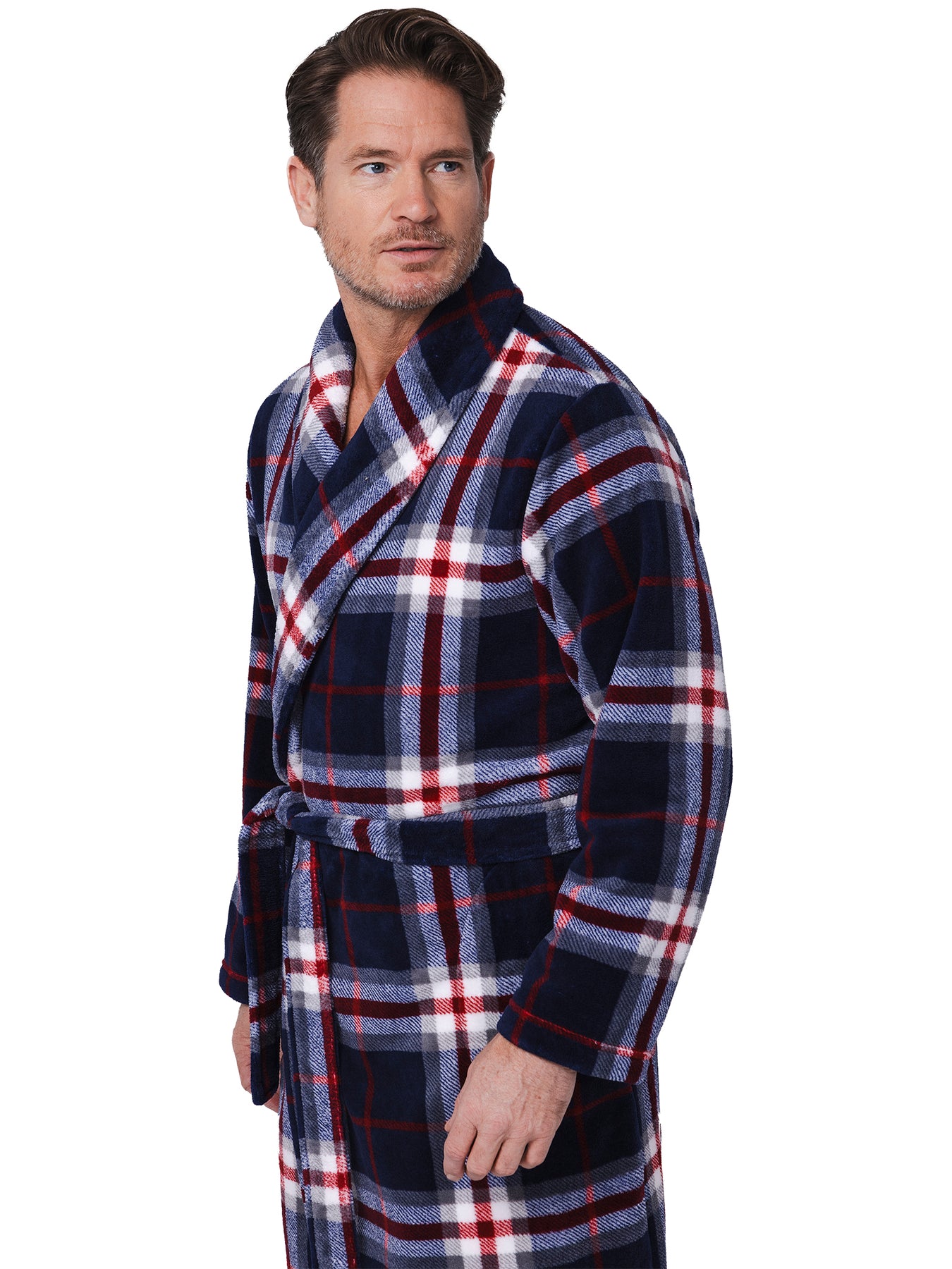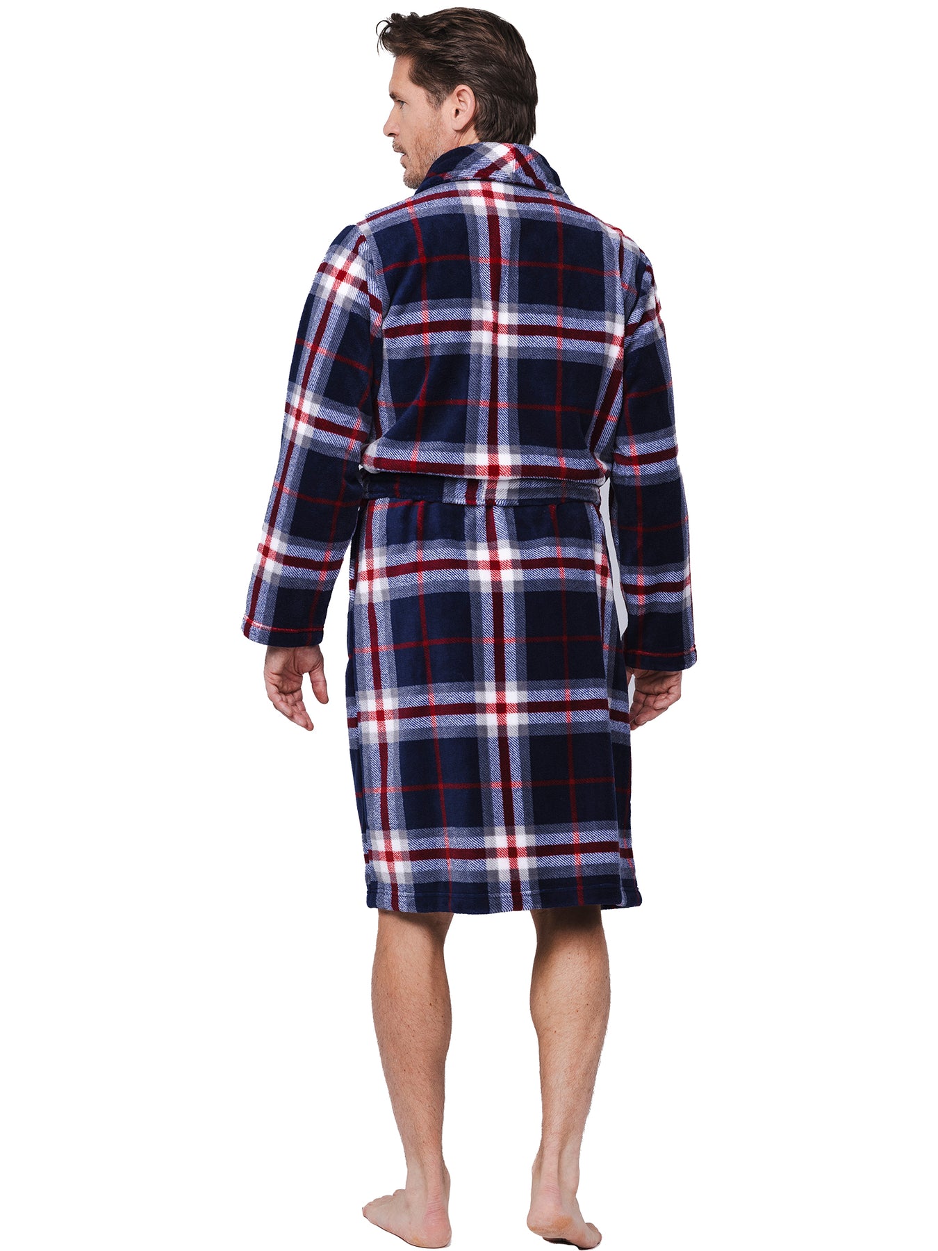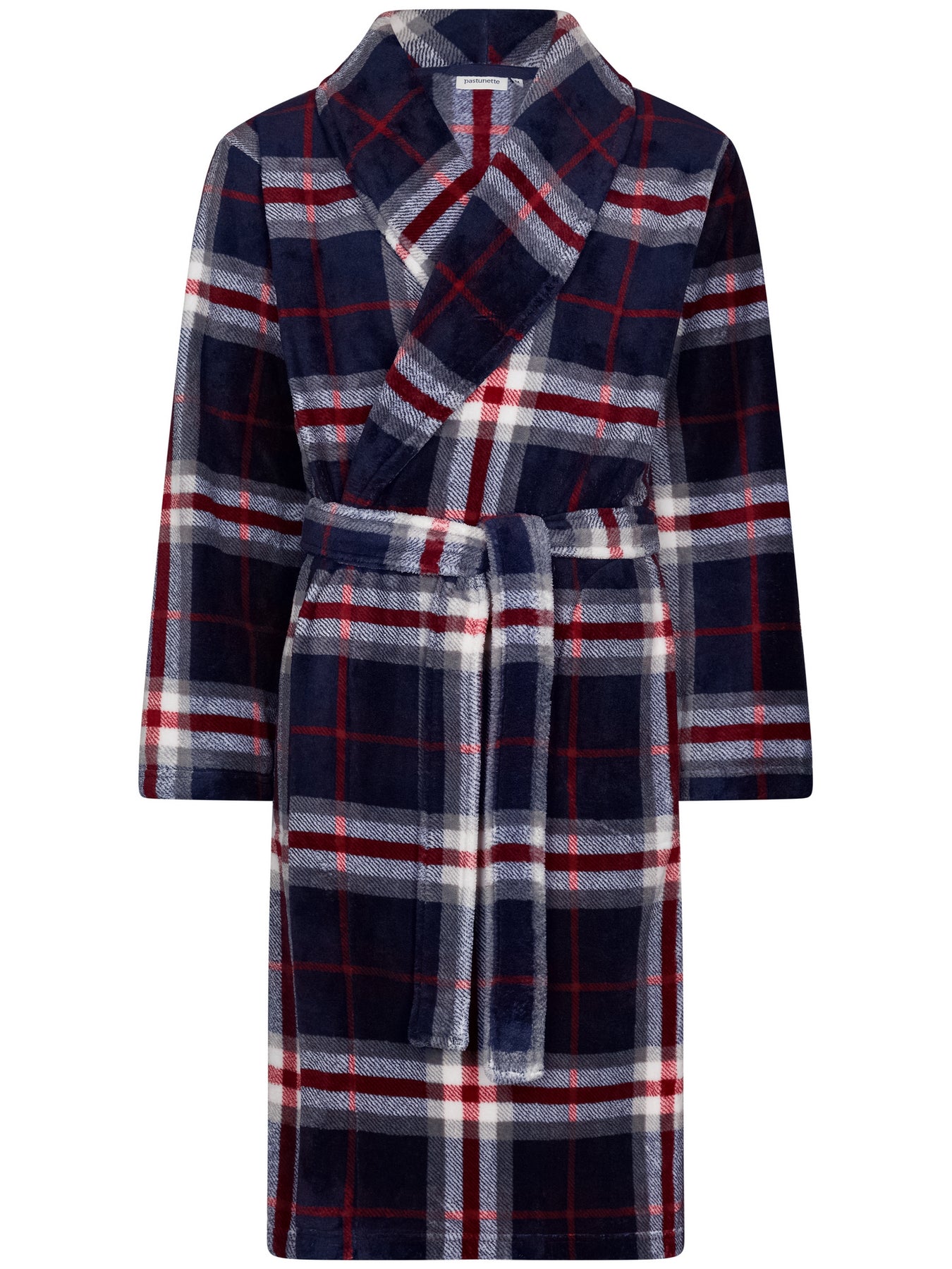 De badjas is donkerblauw van kleur en heeft een ruitenprint in rood en wit. De jas is een overslagmodel met een grote sjaalkraag, zodat je er heerlijk in kunt wegkruipen op koude dagen. Verder heeft de jas lange mouwen, twee zakken aan de voorkant en een ceintuur in de taille.