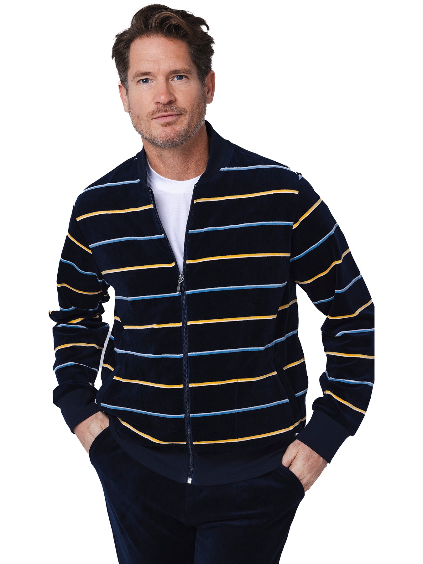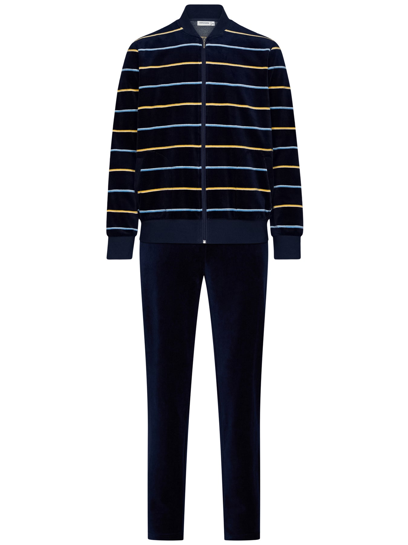 Dit heerlijk warme huispak komt uit de serie Blue Retreat van Pastunette. Het pak is tweedelig en bestaat uit een vest en een lange broek. Het vest is donkerblauw van kleur met een strepenprint in blauw en geel. Het heeft een rits sluiting, lange mouwen en twee zakken aan de voorkant. Leuk detail is de donkerblauwe ribafwerking aan de hals, mouwen en onderkant van de top. De broek is uni donkerblauw van kleur en heeft een elastische tailleband met trekkoord voor een optimale pasvorm. Verder heeft de broek praktische steekzakken.