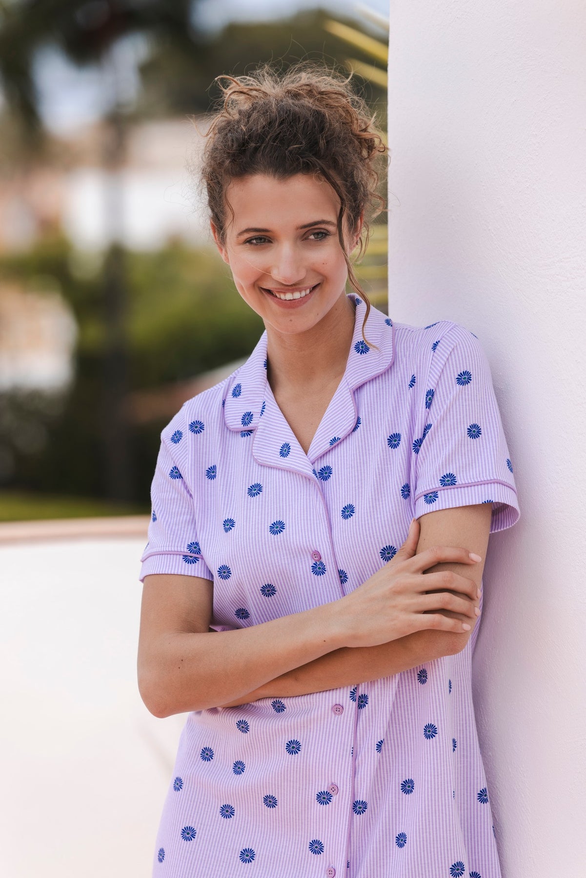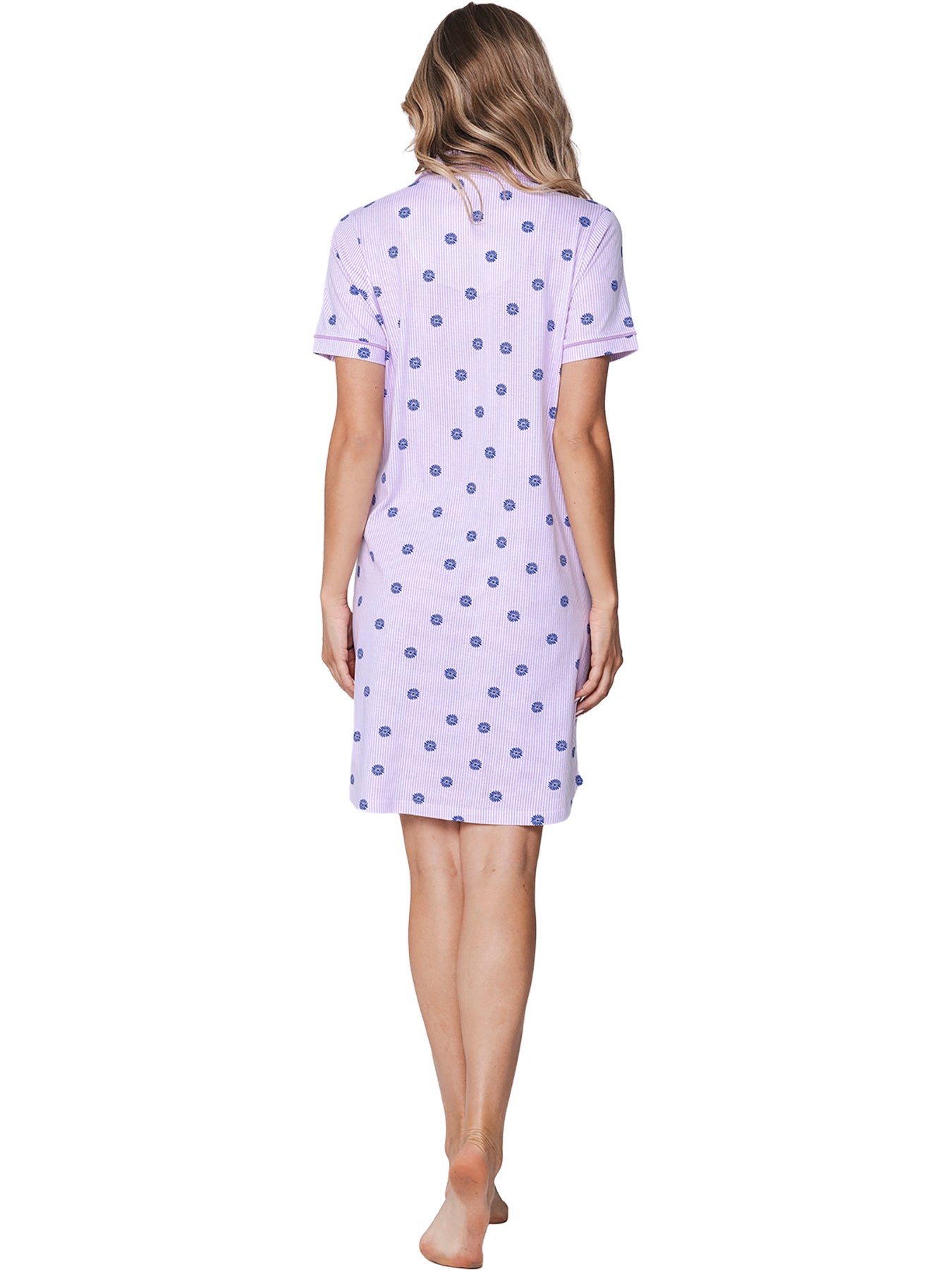 Het nachthemd is lichtpaars met wit gestreept en heeft een all-over bloemen dessin in paars. Het model heeft korte mouwen en een doorknoop sluiting. Het kraagje geeft het item een stijlvolle look. Speelse details zijn de afgeronde onderkant en de contrasterende piping langs de mouwen en hals.