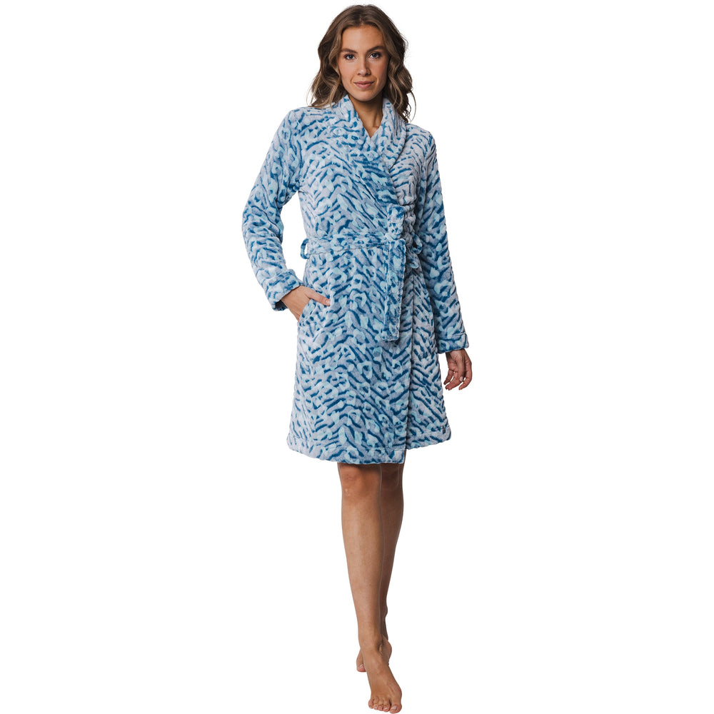 De ochtendjas is turquoise van kleur met een all-over fantasie leopard dessin in groen tinten. De jas heeft lange mouwen en twee diepe steekzakken aan de voorzijde. Verder heeft de jas een sjaalkraag. De jas kan je met een ceintuur in de taille vastmaken. Deze jas is als een warme omhelzing op een koude winterochtend. Zacht en knus, het omhult je lichaam met ultiem comfort.
