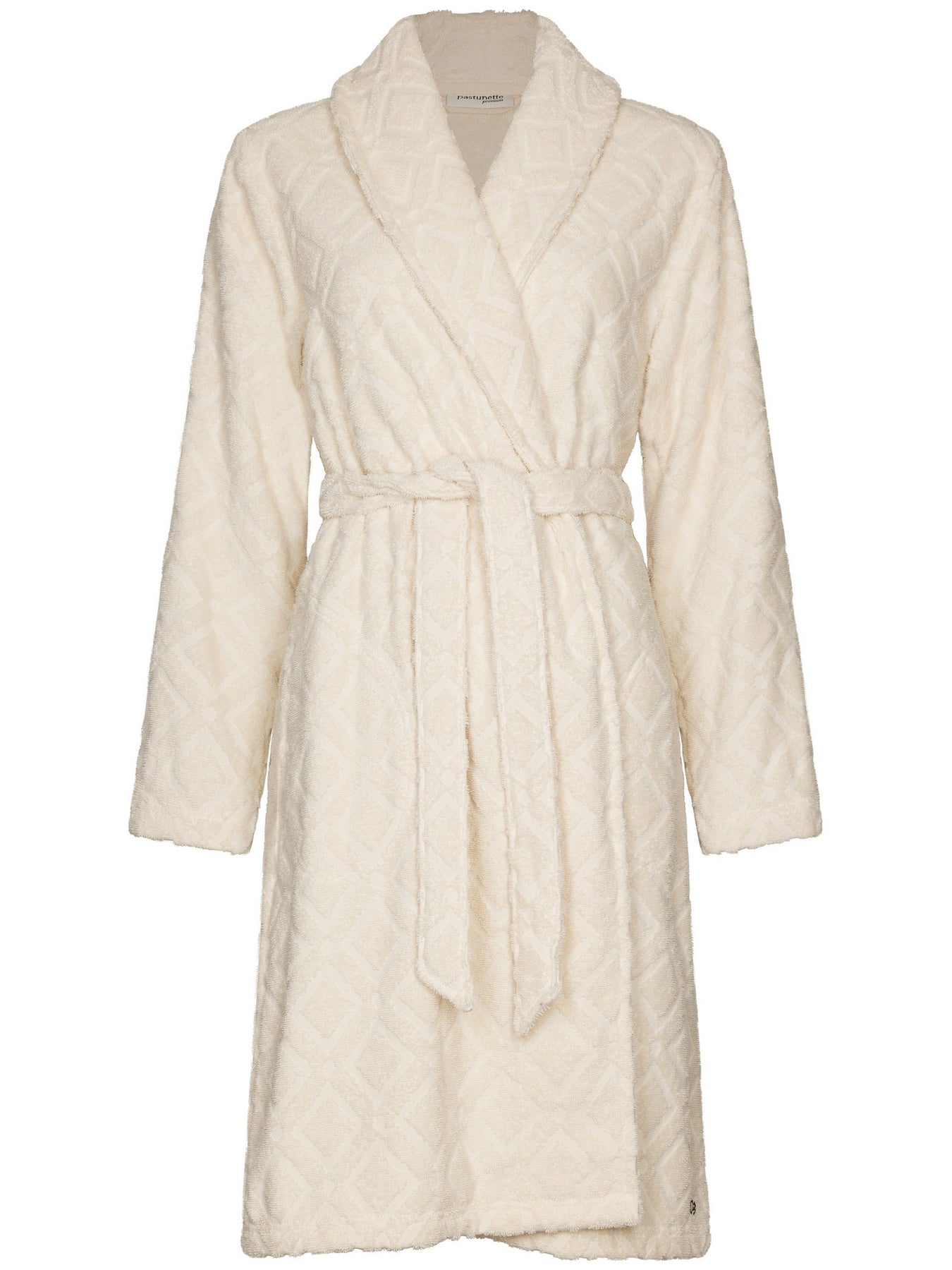Deze comfortabele en stijlvolle badjas van Pastunette Premium is uitgevoerd in een 100% katoen jacquard terry (badstof) kwaliteit en is ecru van kleur.