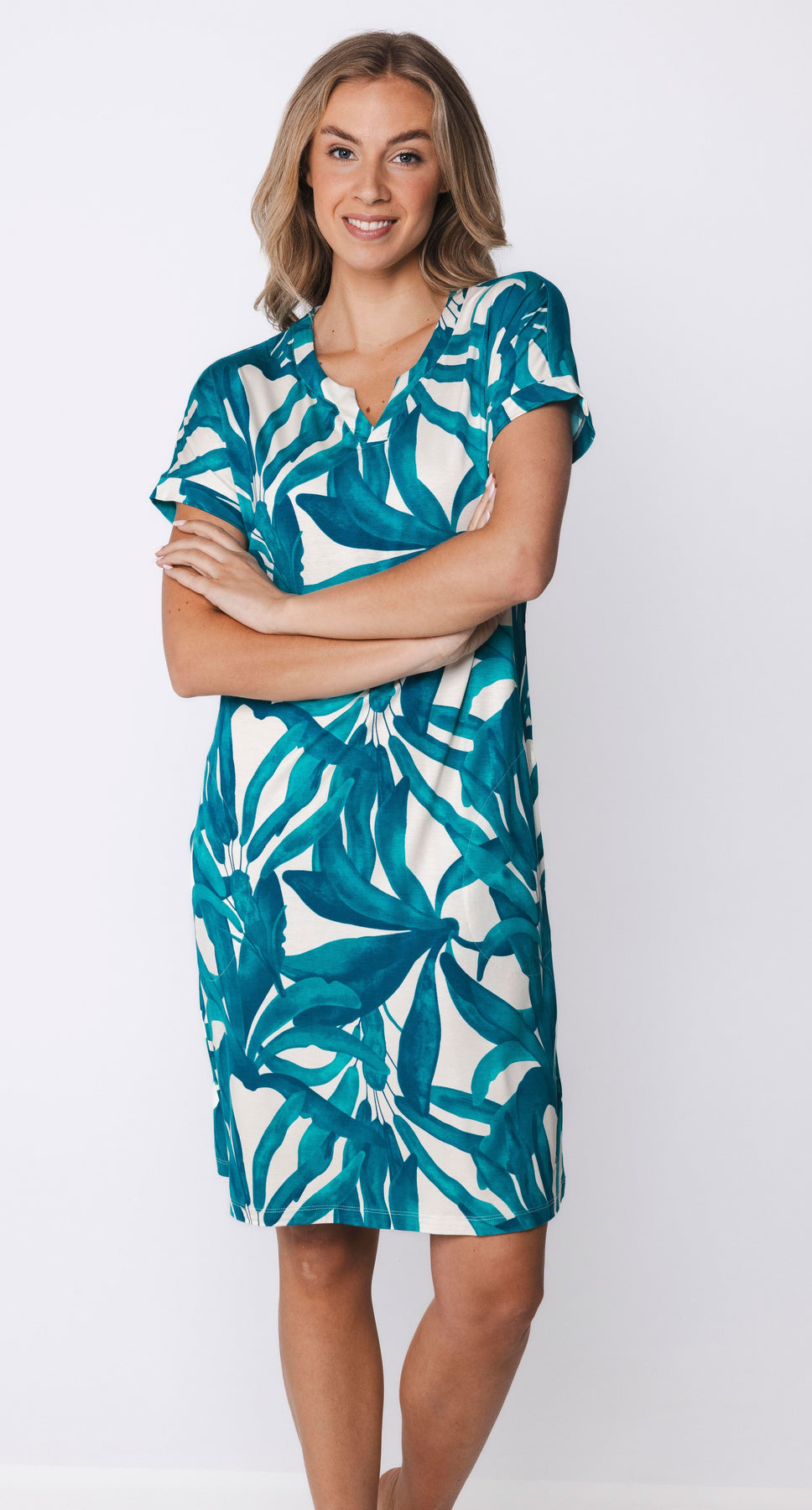 Het nachthemd is uitgevoerd in een ecru kleur en heeft een sprekend bladeren dessin in turquoise tinten, wat zorgt voor een zomerse en elegante uitstraling. Het model heeft korte mouwen en een ronde hals met een subtiele V-uitsparing, wat het nachthemd een vrouwelijke touch geeft.