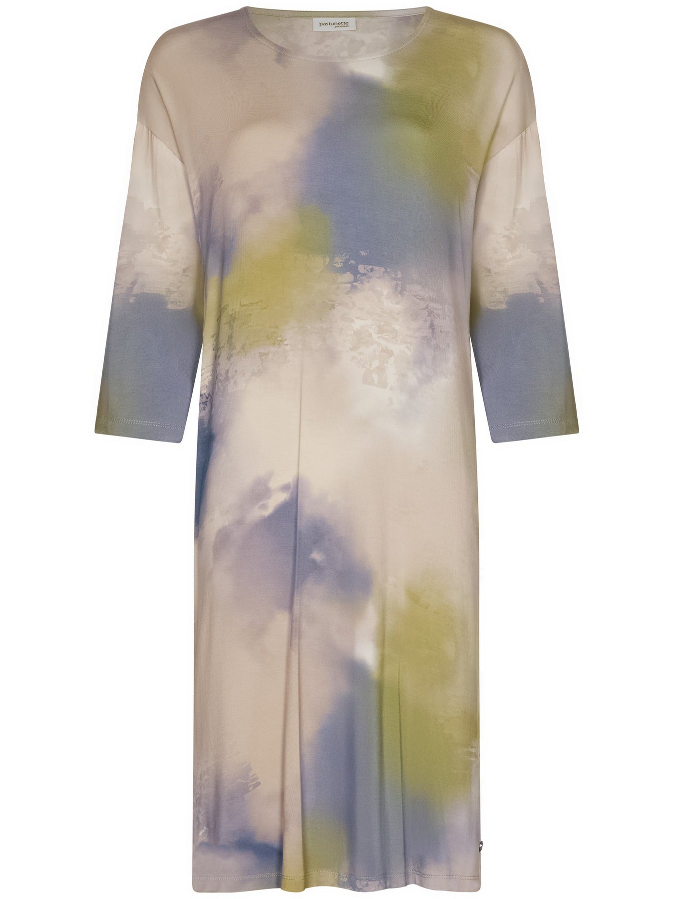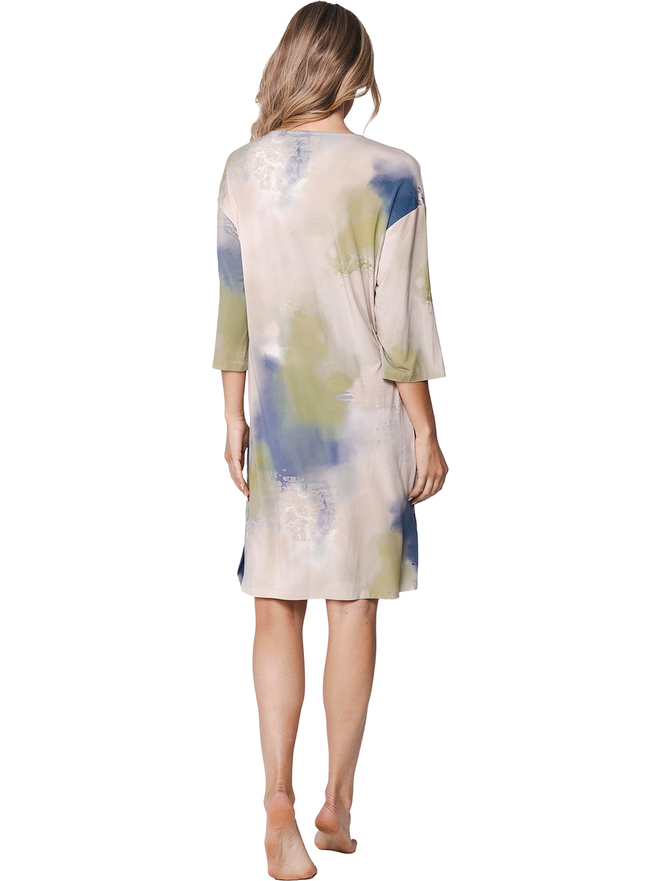 Het nachthemd is uitgevoerd in een beige kleur en heeft een verfijnd fantasie dessin in blauw en groentinten, wat zorgt voor een rustige en stijlvolle uitstraling. Het model heeft driekwart mouwen en een ronde hals. Een mooi detail zijn de splitjes aan de onderzijde van het nachthemd, die extra bewegingsvrijheid bieden.