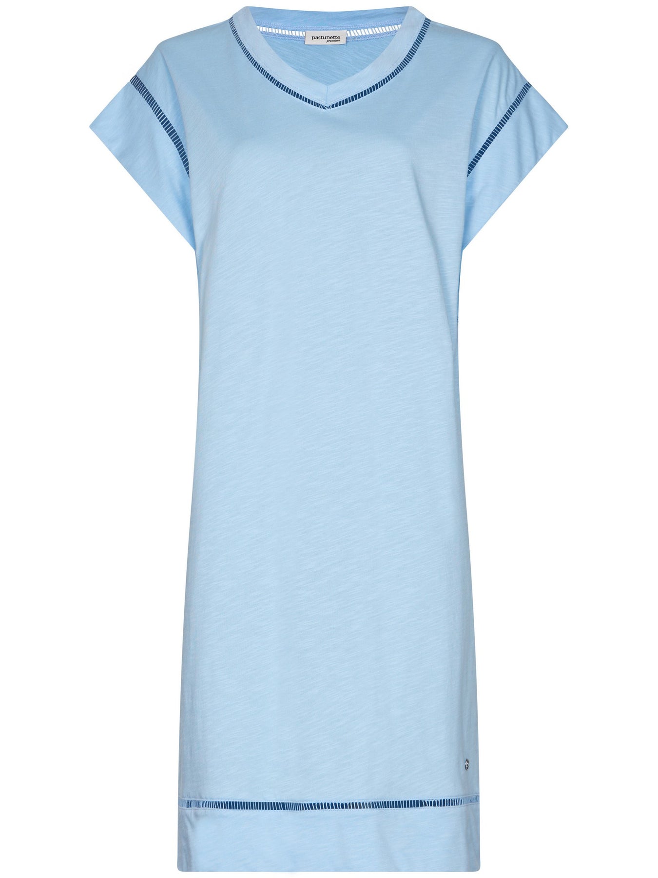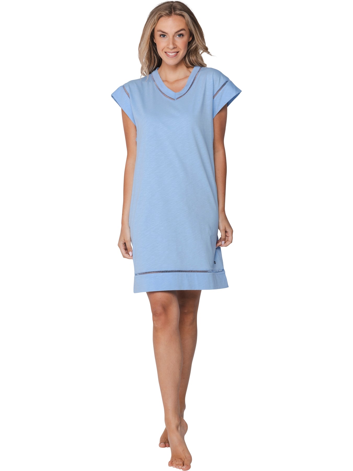 Het nachthemd is uitgevoerd in een uni lichtblauwe kleur en heeft korte kapmouwtjes met een vrouwelijke V-hals. Een mooi detail is de verfijnde afwerking bij de mouwen, hals en onderkant van het nachthemd, wat zorgt voor een elegante uitstraling.