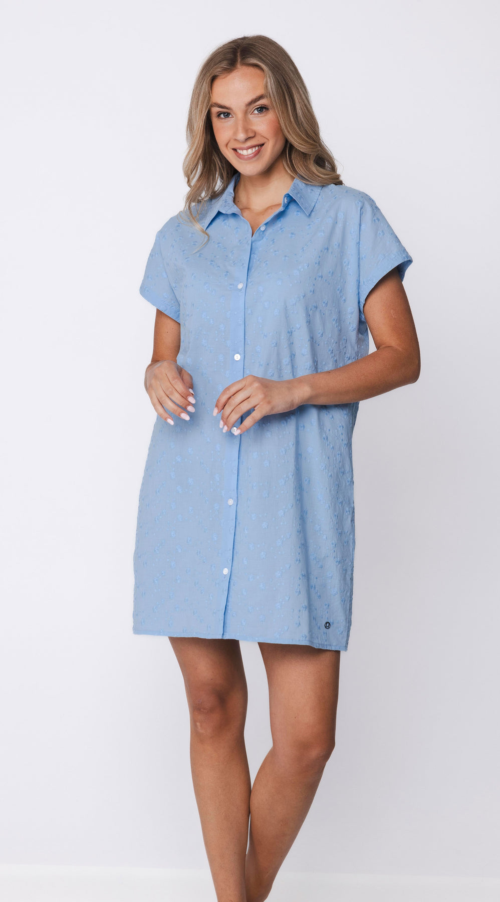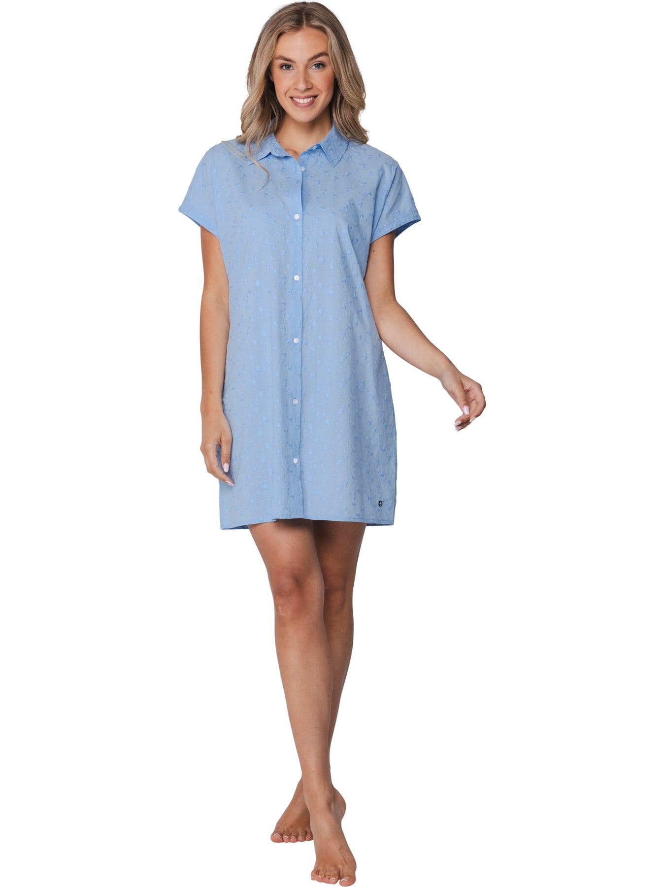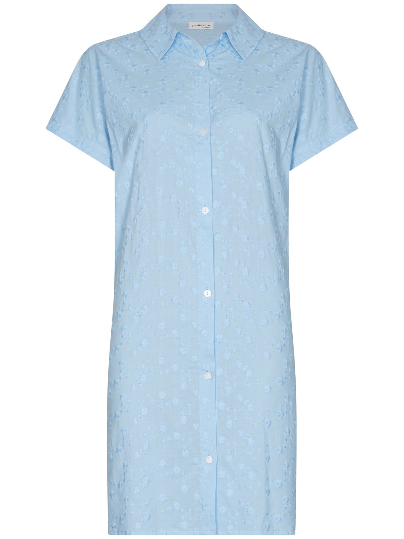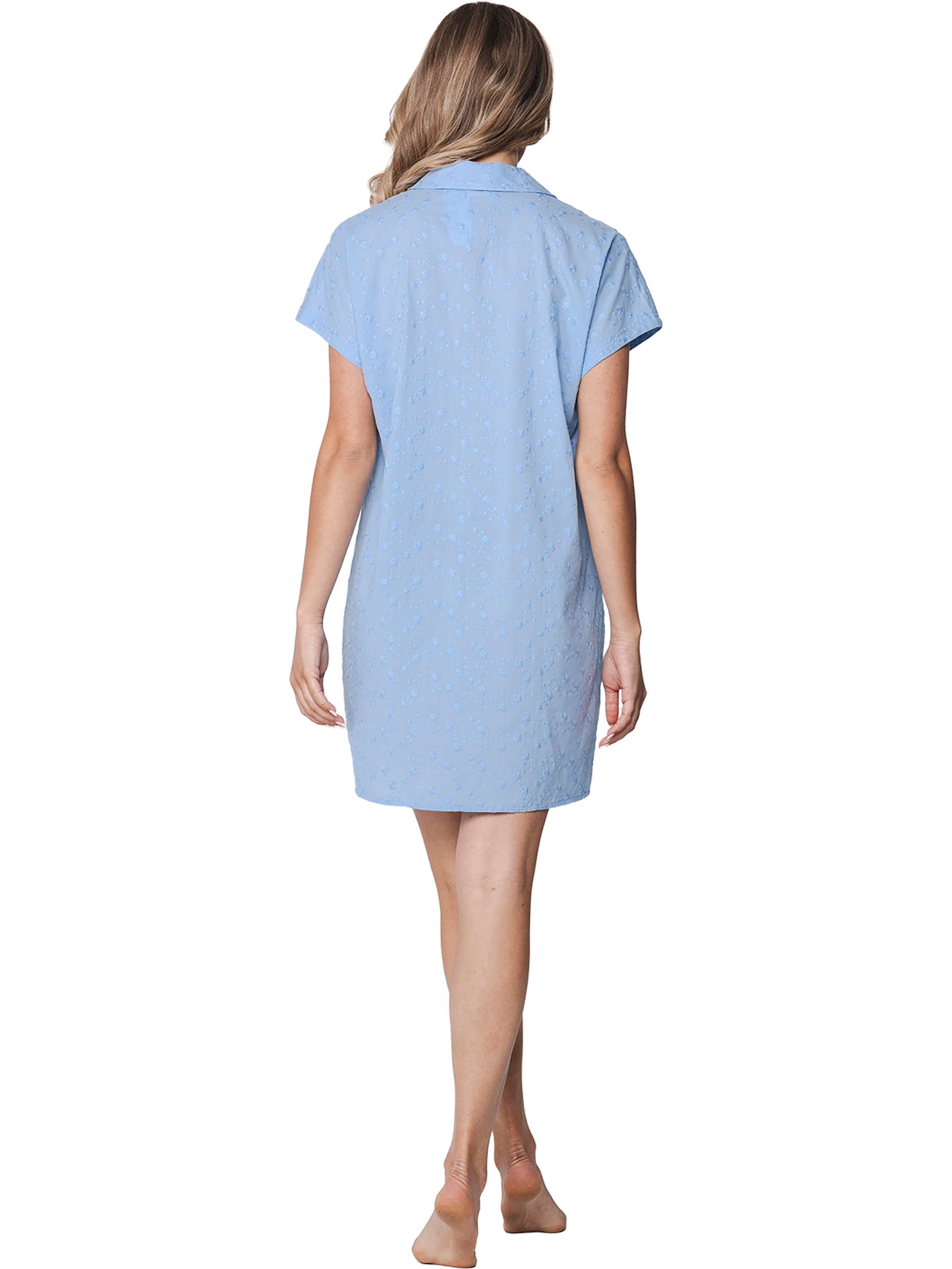 Het nachthemd is uitgevoerd in een uni lichtblauwe kleur en is gedecoreerd met een geborduurde print van bloemetjes. Het model heeft korte mouwen, een volledige doorknoop sluiting en is voorzien van een kraagje, wat zorgt voor een klassieke uitstraling.