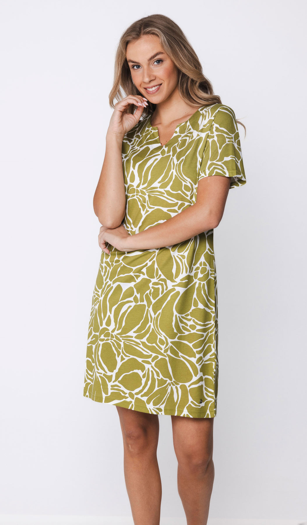 Het nachthemd is uitgevoerd in een groene kleur met een stijlvol bloemendessin. Het model heeft korte mouwen en een ronde hals met een subtiele V-uitsparing, wat zorgt voor een vrouwelijke en prettige pasvorm.