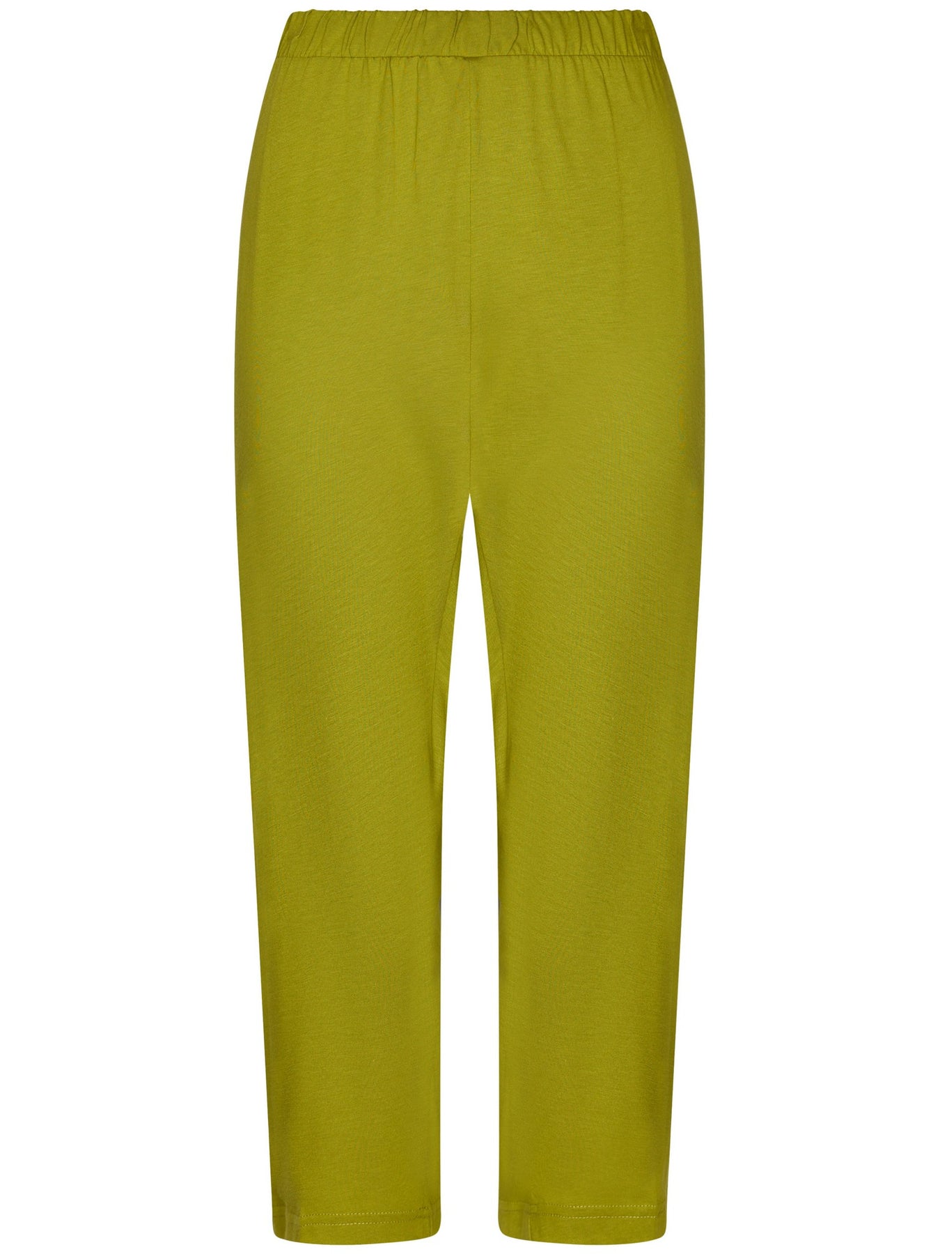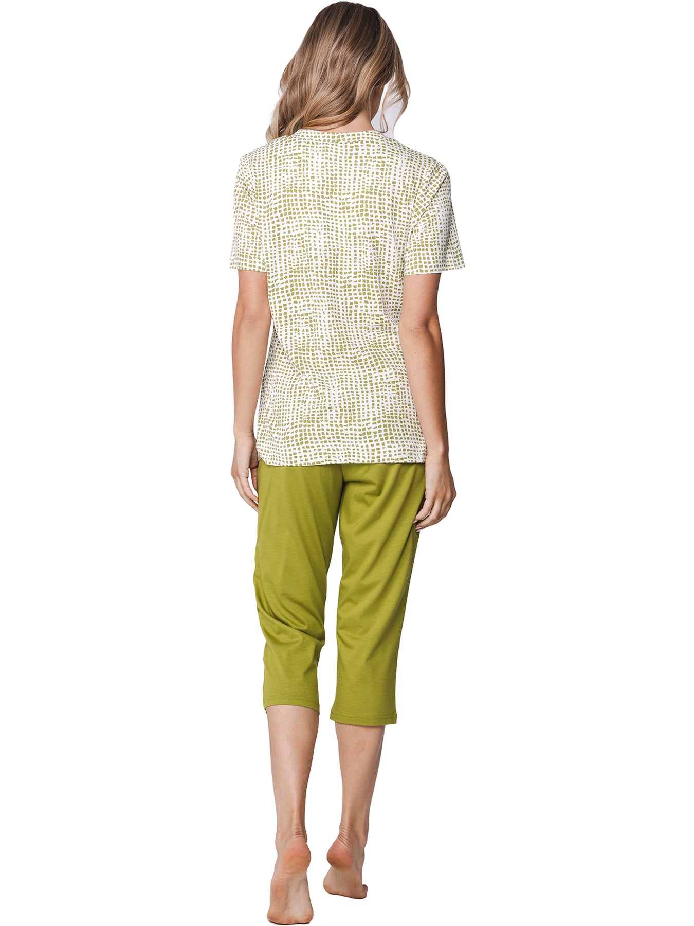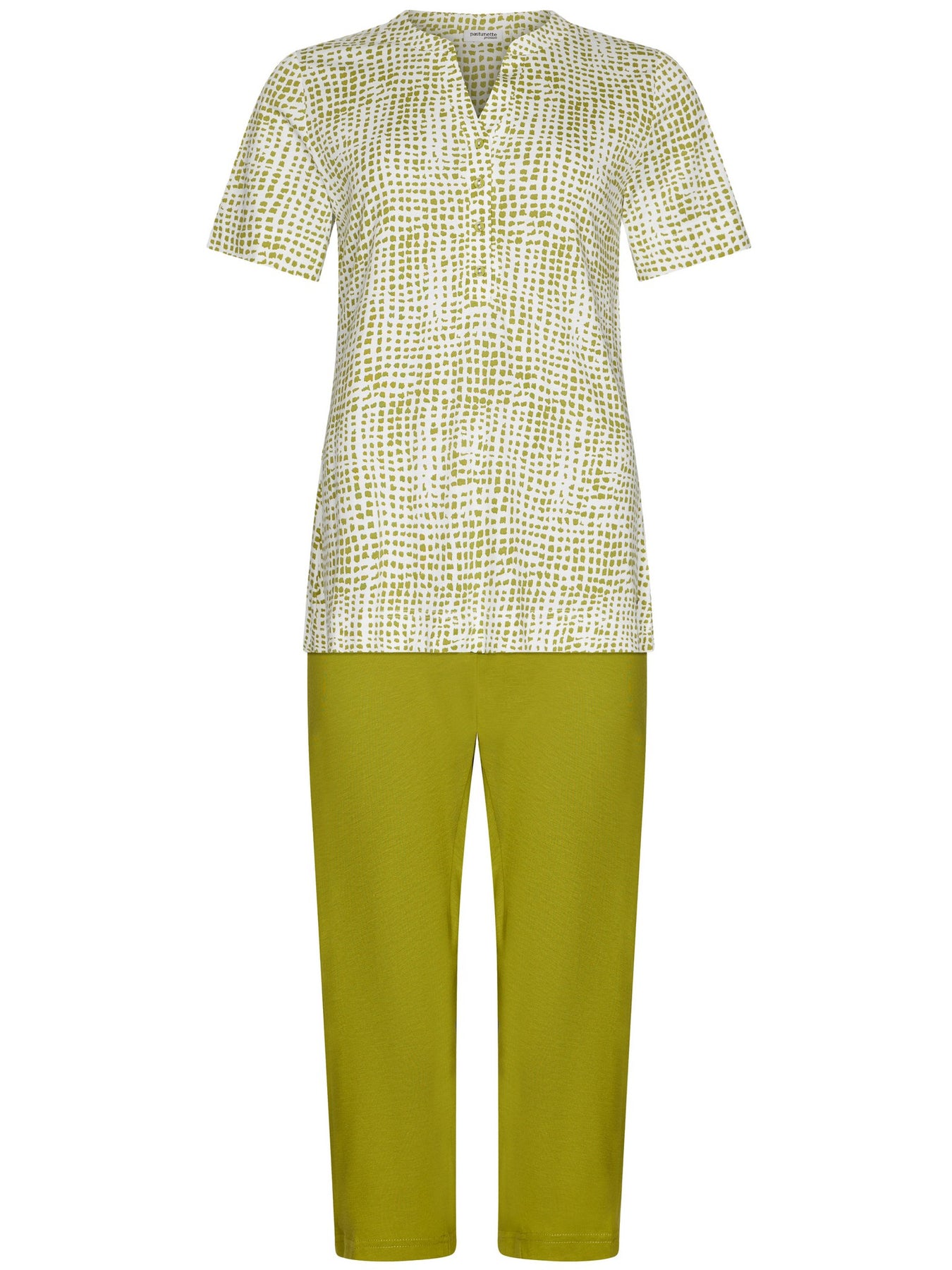 De top is wit van kleur en heeft een verfijnd grafisch dessin in het groen. De top is voorzien van korte mouwen en een ronde hals met v-insnede en knoopsluiting. De driekwart broek is uni groen van kleur en heeft een elastische tailleband voor een comfortabele en optimale pasvorm.