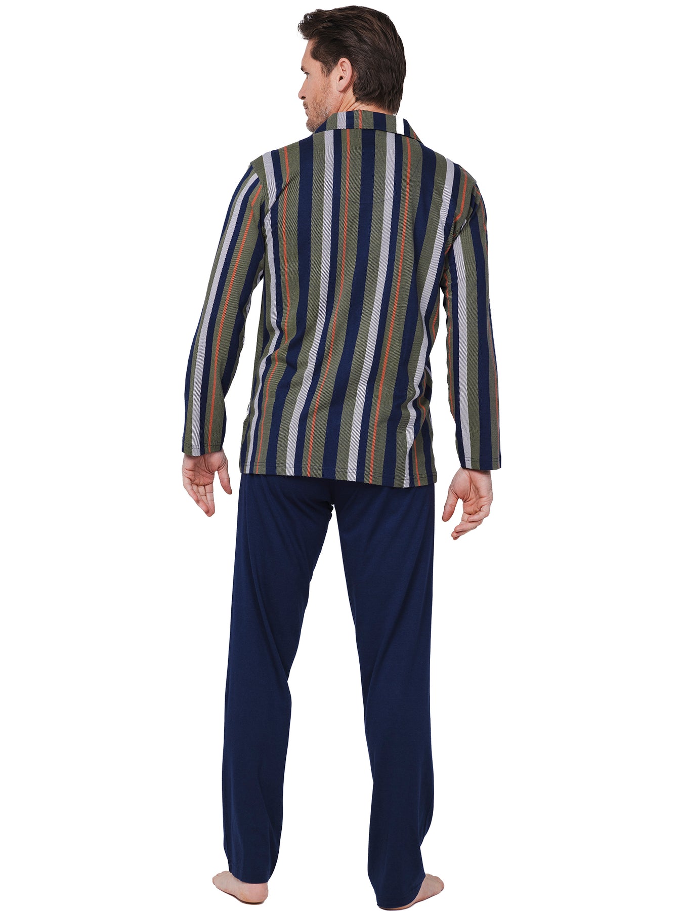 De top is donkerblauw van kleur en heeft een streepdessin in wit, groen en oranje. De top heeft lange mouwen, een doorknoopsluiting, een kraagje en een borstzakje. De broek is uni donkerblauw en heeft een recht model. Verder heeft de broek een elastische tailleband voor een optimale en comfortabele pasvorm en een achterzak voor extra gemak.