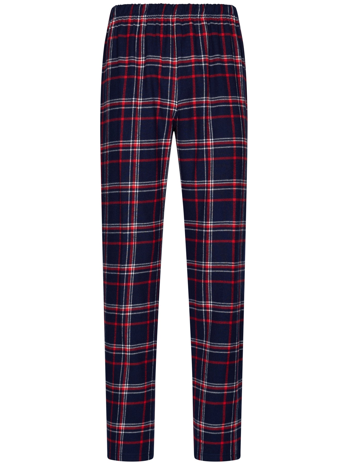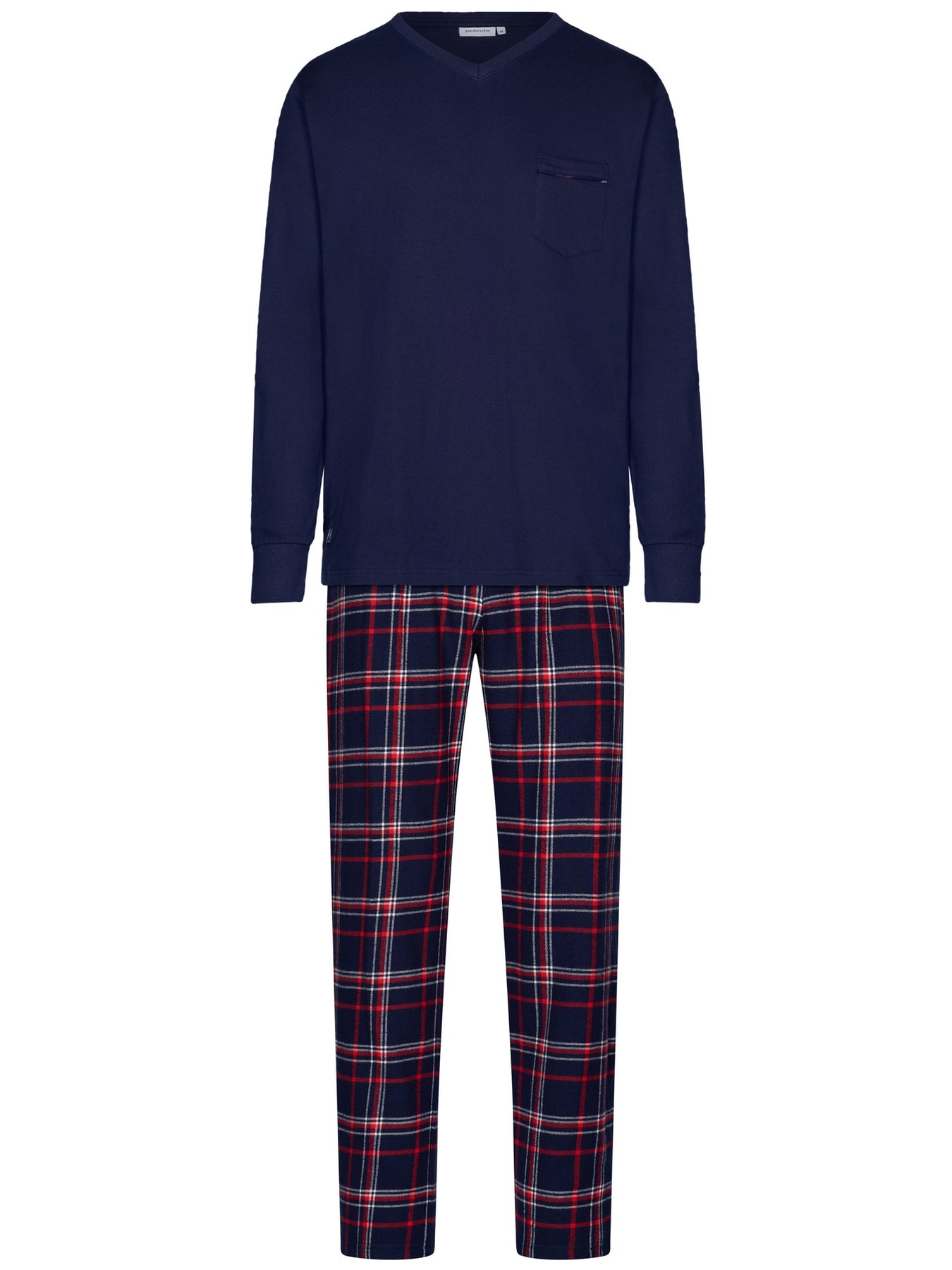 De top is uni donkerblauw van kleur, heeft lange mouwen, een V-hals en een borstzakje. De lange broek is donkerblauw van kleur met een ruitprint in rood en wit. De broek heeft een elastische tailleband en boordjes voor een optimale pasvorm.