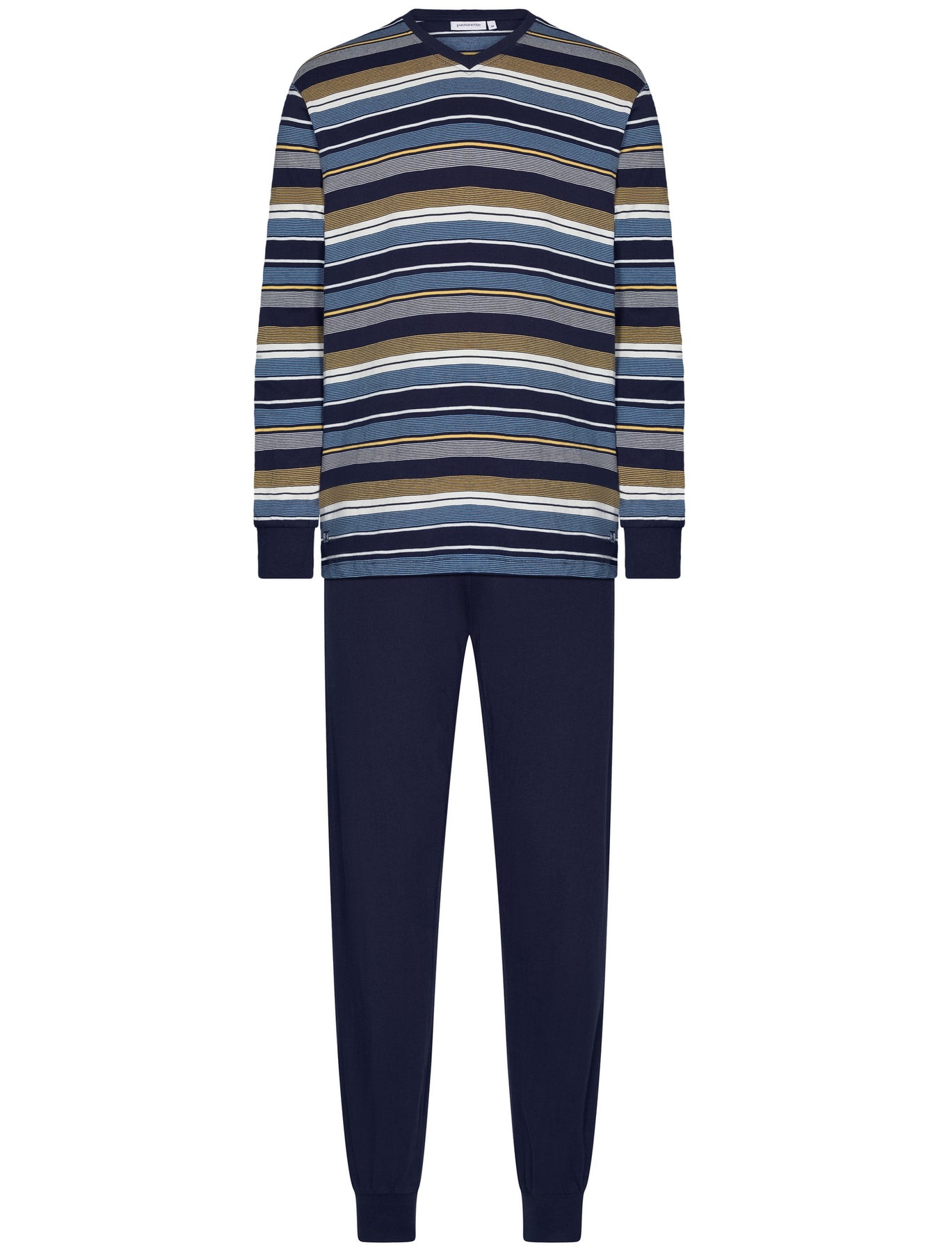 De top is gestreept in de kleuren blauw, geel en wit. De top heeft lange mouwen en een V-hals. De mouwen en de onderkant van de top zijn afgewerkt met donkerblauw rib boordjes. De lange broek is uni donkerblauw van kleur en heeft een elastische tailleband en boordjes voor een optimale pasvorm. Verder heeft de broek een achterzak.