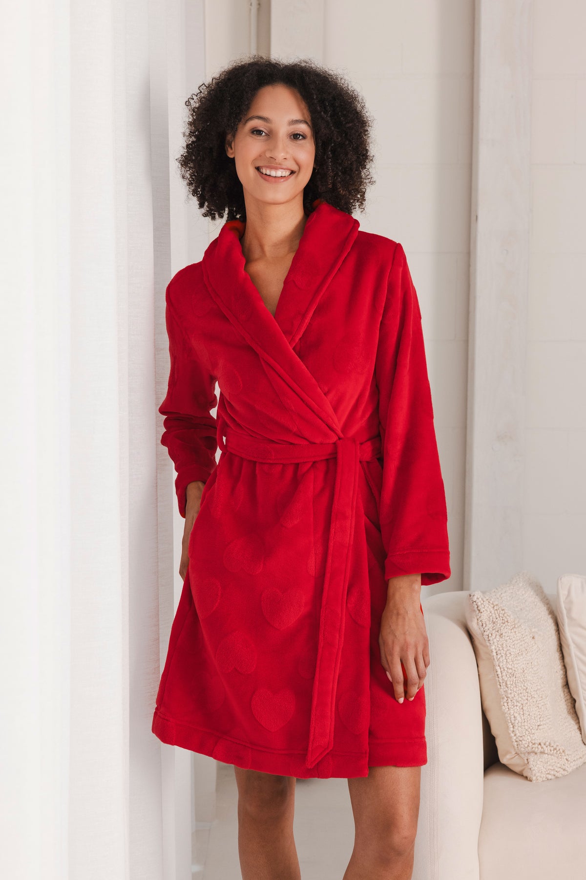 Deze heerlijke zachte en warme badjas komt uit de Aspen Ski serie van Rebelle. De badjas is rood van kleur met een hartjes dessin, heeft lange mouwen en twee zakken aan de voorkant. Het is een overslagmodel met een grote sjaalkraag, zodat je er lekker in kunt wegkruipen op koude dagen. Leuk detail is de ceintuur in de taille en de subtiele glitters in de hartjes. Deze ochtendjas is perfect om je warm te houden tijdens de koude winterdagen!